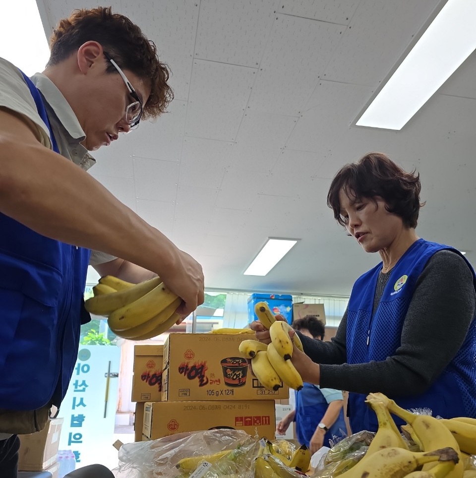 푸드뱅크 물품지원을 소분하고 사진을 찍고있다.