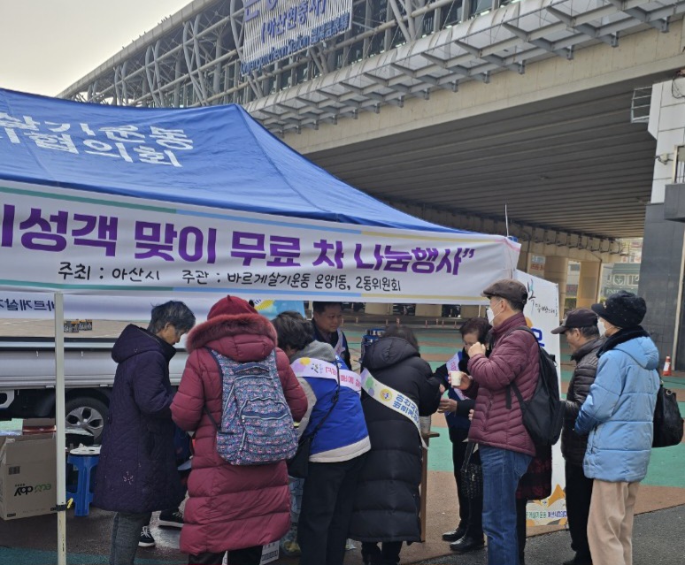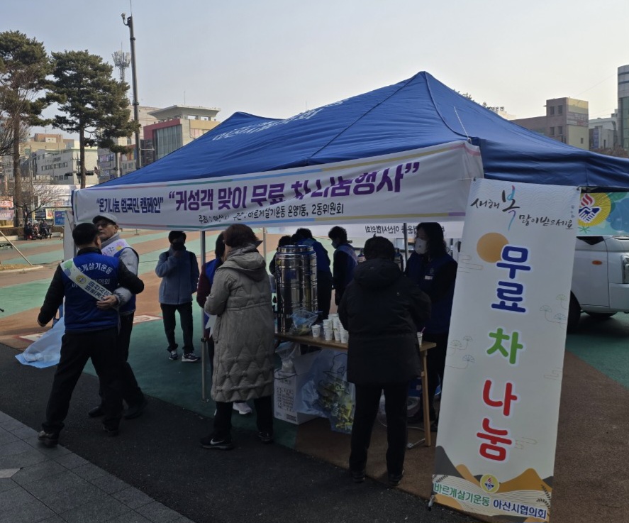 진실·질서·화합을 3대 이념으로 하는 바르게살기운동 온양1동위원회(위원장 서춘원), 온양2동위원회(위원장 안병갑)는 설날 명절을 맞아 고향을 찾은 귀성객들을 위한 무료 차 나눔 봉사활동을 실시하였습니다.