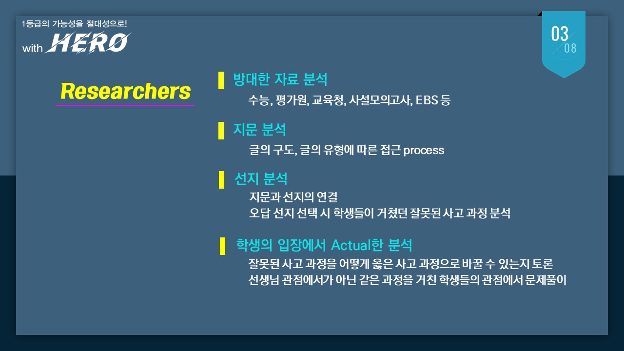 수능의 관점과 출제자의 의도를 정확하게 분석하고 파악합니다.