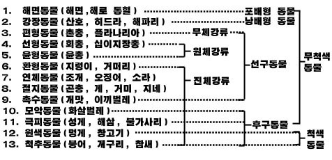 - 척색동물 : 발생 도중 척색을 형성한다. 원색 척추동물에 해당된다.