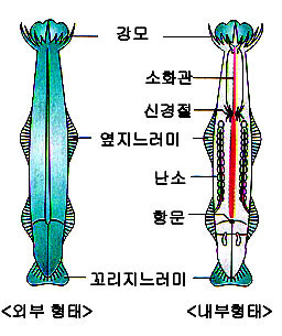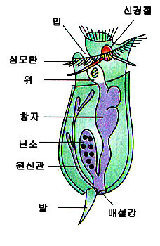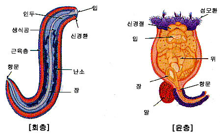 ·몸은 좌우 대칭이고, 머리에 섬모환이 있어서 이것으로 이동하고, 먹이를 잡는다.