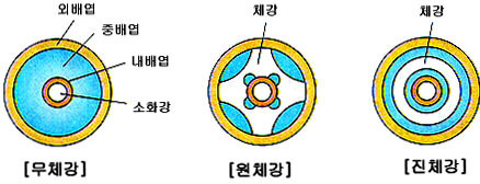 - 원체강 동물 : 난할강의 빈 틈에 간충직이 들어 있는 좁은 체강을 가진 동물로 선형·윤형동물이 있다.