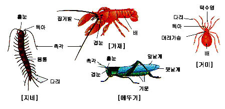 ㉢ 다지류 : 몸은 머리와 몸통으로 구분되며, 같은 구조의 여러 체절로 되어 있고, 체절마다 1∼2쌍의 다리가 있다. 대부분 기관으로 호흡한다.