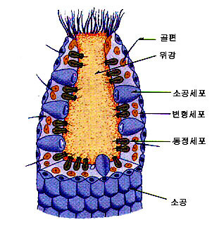 ·동정세포의 편모로 물의 흐름을 일으켜 먹이를 잡아 세포내 소화를 한다.