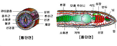 ·몸 표면은 큐티클로 덮이고, 체벽의 환상근과 종주근으로 연동 운동을 한다.
