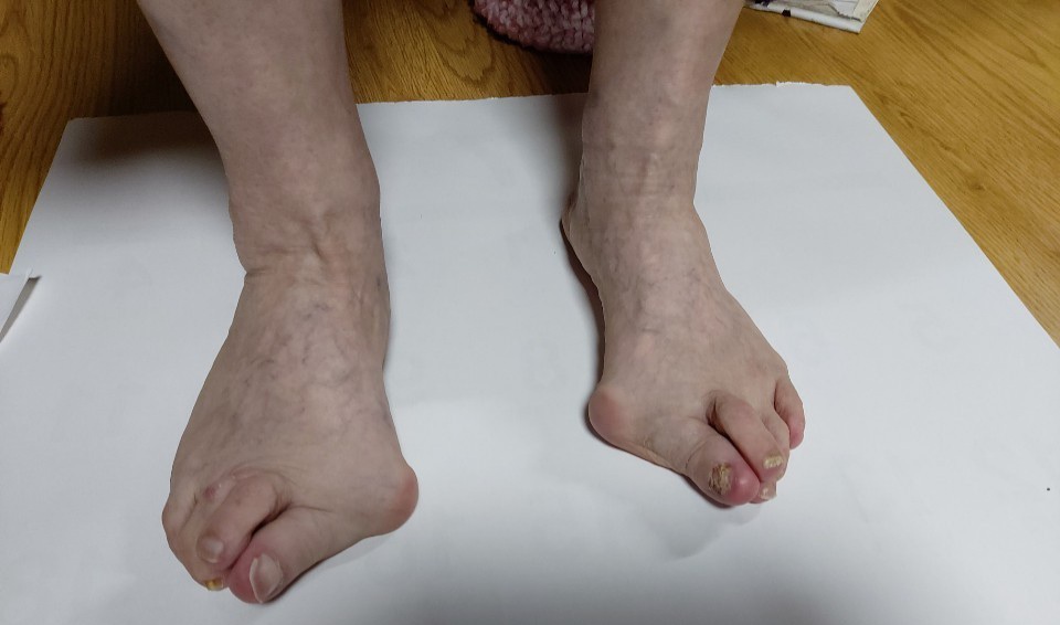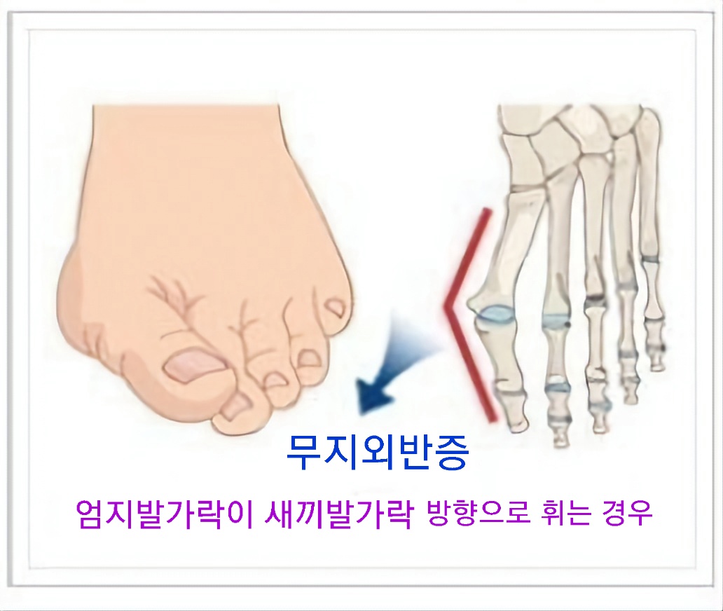 ์ฆ์์ด ๋ค๋ฐ๋ฅธ๋ค. ๊ฑท๊ฑฐ๋ ์ ์์ ๋ ๋ฐ๊ฐ๋ฝ์ด ๋ด์ธก์ผ๋ก ํฅํ๋ ๋ด์กฑ์ง