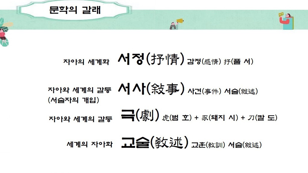 [문학]을 먼저 개념으로 이해하기 위해서는 문학이 어디에 속하고, 문학의 종류에는 어떤 것이 있는지 살펴보는 게 좋습니다. 개념이라는 말이 좀 어려운 말인데 개념을 한자로 쓰면 槪念(대개 개, 생각 념)이 되는데 [대개 개] 글자를 풀어보면 그 뜻을 정확하게 이해할 수 있습니다. 이 글자는 木(나무 목)과 旣(이미 기)가 결합된 글자로, 어디에 속하고 어떻게 나뉘는지 나무 가지 뻗은 것처럼 다 파악하고 있다는 의미를 갖고 있습니다. 그래서 개념을 파악한다는 것은 상위 개념과 하위 개념을 안다는 것으로 이해하면 되겠습니다.