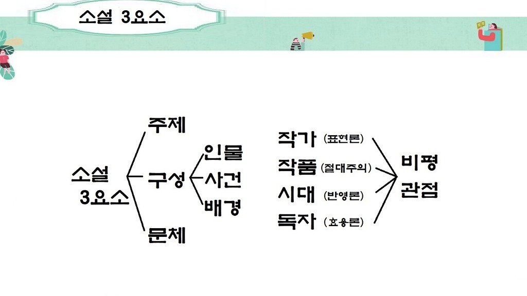 좋은 문학 작품은 개인의 정서 발달에 엄청 도움이 되고 우리를 서로 어울려 행복하게 만드는 아주 중요한 사회적 가치입니다. 그런 작품을 생산해낸 작가는 정말 위대한 일을 한 것입니다. 우리는 어떤 작품에서 큰 감동을 얻을 수 있을까요? 어떤 작품이 명작으로 많이 읽히면 우리 사회를 더 아름답게 만들까요? 이런 문제를 궁리하는 게 바로 문학 비평입니다. 정확하게 분석하는 작업도 필요하겠지요. 그러기 위해서는 소설을 이루는 요소와 이런 요소를 평가하는 여러 방식에 대한 이해가 필요합니다. 표현론적 관점은 작가의 주제의식을 주로 분석합니다. 그러려면 작가의 인생관과 성장과정 사고 방식을 탐구해야겠지요. 절대주의 관점은 작품의 완성도를 높이기 위한 드라마틱한 구성과 잘 읽히는 문체를 분석합니다. 반영론적 관점은 작품이 탄생한 사회적 배경을 밝혀내는데 시대를 잘 반영한 작품은 세대간의 공감을 이뤄내는 데 큰 역할을 합니다. 효용론적 관점은 어떤 작품이 어떤 사람에게 어떻게 도움이 되는지 밝혀내는 연구 방식입니다.