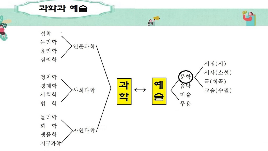 글쓰기를 할 때 무척 신경쓰이는 게 문법이라는 건 아마 다들 공감할 겁니다. 그래서 쓰기 능력을 기르기 위해서는 [문법]을 공부해야 한다는 건 쉽게 이해할 수 있을 것입니다. [문학] 과목과 [독서] 과목은 쉽게 [문학], [비문학]으로 구분하면 될 것입니다. 쉽게 문학은 시, 소설, 수필 같은 작품을 말하고 비문학은 논설문, 설명문 같은 글을 말합니다. 이 두 그룹이 서로 어떻게 다른지 알기 위해서는 과학과 예술의 차이를 이해해야 합니다.