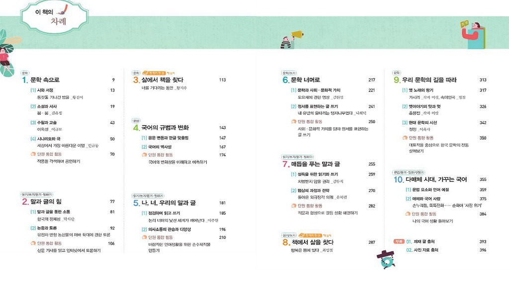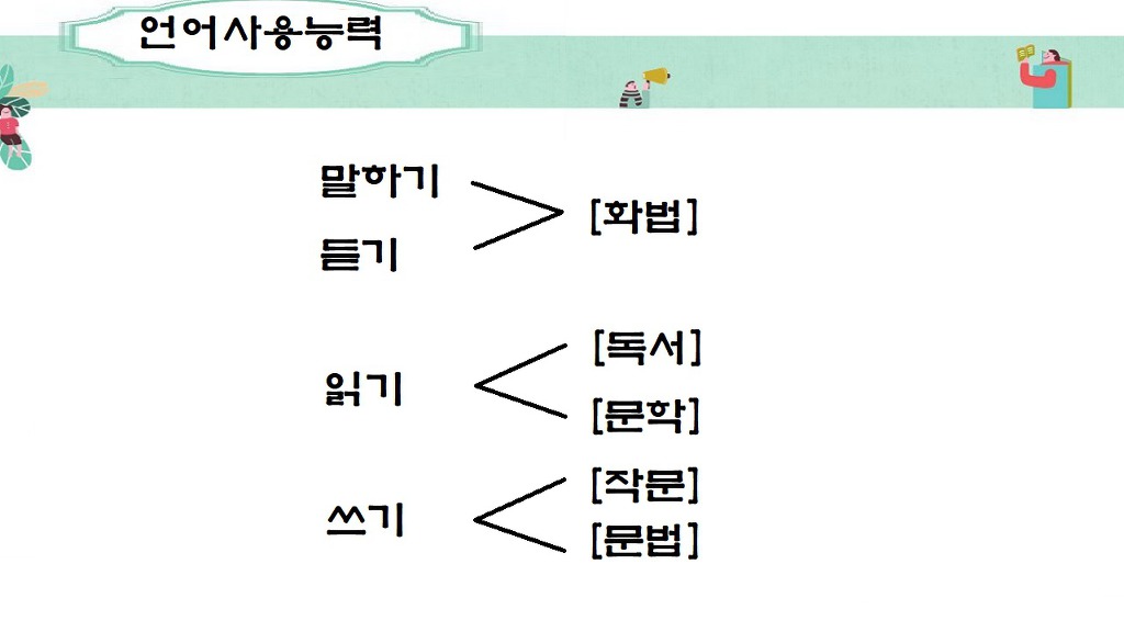 처음 배우는 단원이 [1단원 문학 속으로]와 [6단원 문학 너머로]입니다. 1학년 국어 시간에 배우는 [국어] 과목에서 문학 단원은 [9단원 우리 문학의 길을 따라]를 포함해 3개 단원입니다. 먼저 궁금증이 일어나는 것은 [국어] 교과서는 어떻게 내용을 구성하는가 하는 점일 겁니다. [국어]라는 과목에서 배우는 내용은 크게 언어 사용 능력을 키우기 위해 짜여지는데, 언어사용능력이란 간단하게 말하기, 듣기, 읽기, 쓰기 능력을 말합니다. 이런 언어사용능력에 따라 국어 과목은 내용이 구성되어 있습니다.