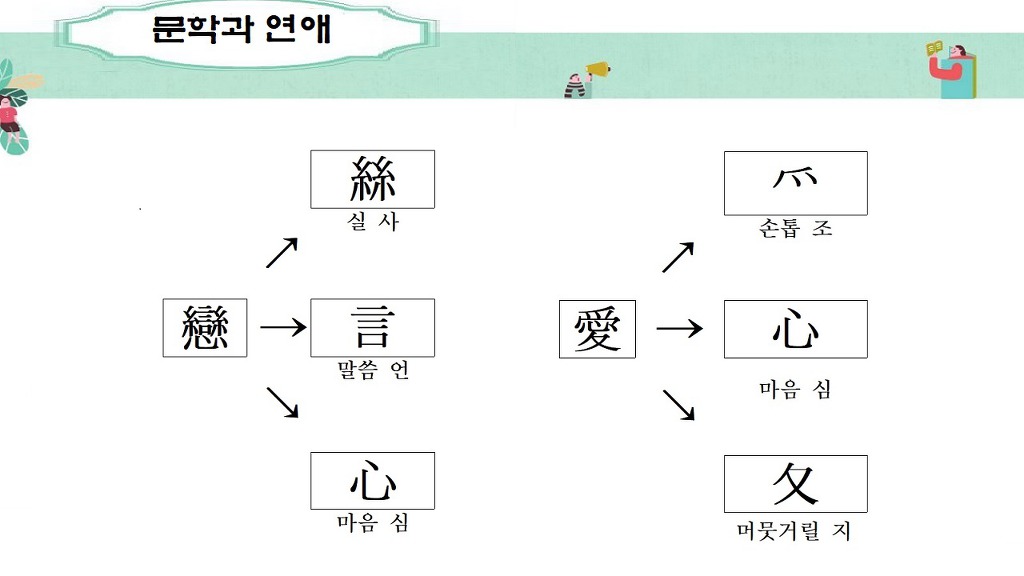 문학의 개념을 파악하는 것도 중요하지만 문학의 본질은 공감인 만큼 함께 느껴야만 정서 발달을 이룰 수 있습니다. 정서 발달이라는 게 좀 어려운 문제라 이를 쉽게 이해하기 위해 문학을 연애에 비유해 봤습니다. 그런데 분석해 보면 문학은 곧 연애라는 걸 알 수 있습니다. 문학은 예술에 속하는 데 예술의 본질은 함께 느끼는 것, 곧 공감하는 것입니다. 분석하고 따져 밝혀내는 과학과는 완전 반대이지요. 연애의 戀(사모할 연) 자는 말로 서로 마음이 연결된다는 뜻이라는 걸 알 수 있습니다. 愛(사랑 애)는 손(爪)과 발(夂)로 마음이 통한다는 뜻인데 연애한다는 것은 말로 통하고 몸으로 느낀다는 의미라는 걸 알 수 있습니다.