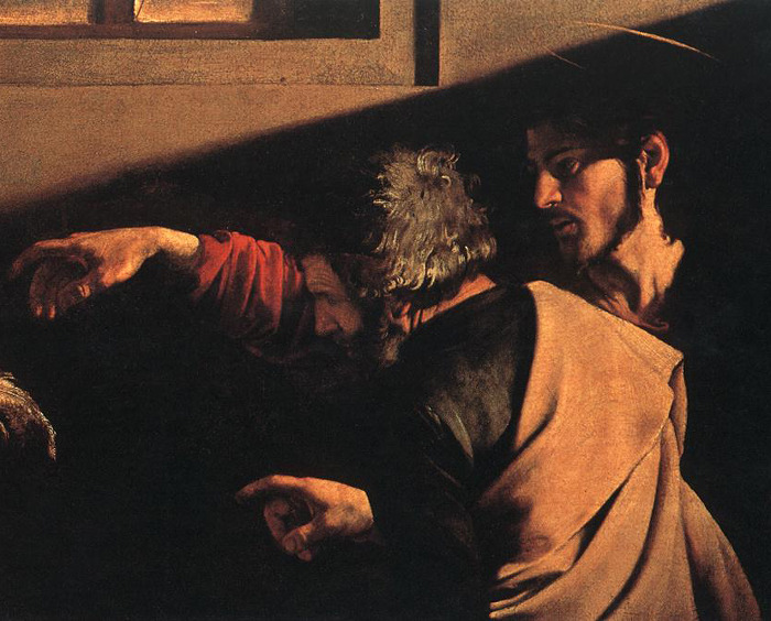 그리스도는 어둠속에 잇는데, 존재만으로도 그림자에 어던 빛을 주고 있는듯하다. 마태오가 본 것은 그것이 전부다. 속세를 떠난 듯한, 말랐지만 힘있는 얼굴과 부름의 손짓,. 그리스도는 교회를 상징하는 덩치 큰 성 베드로에 가려서 잘 보이지 않는다.