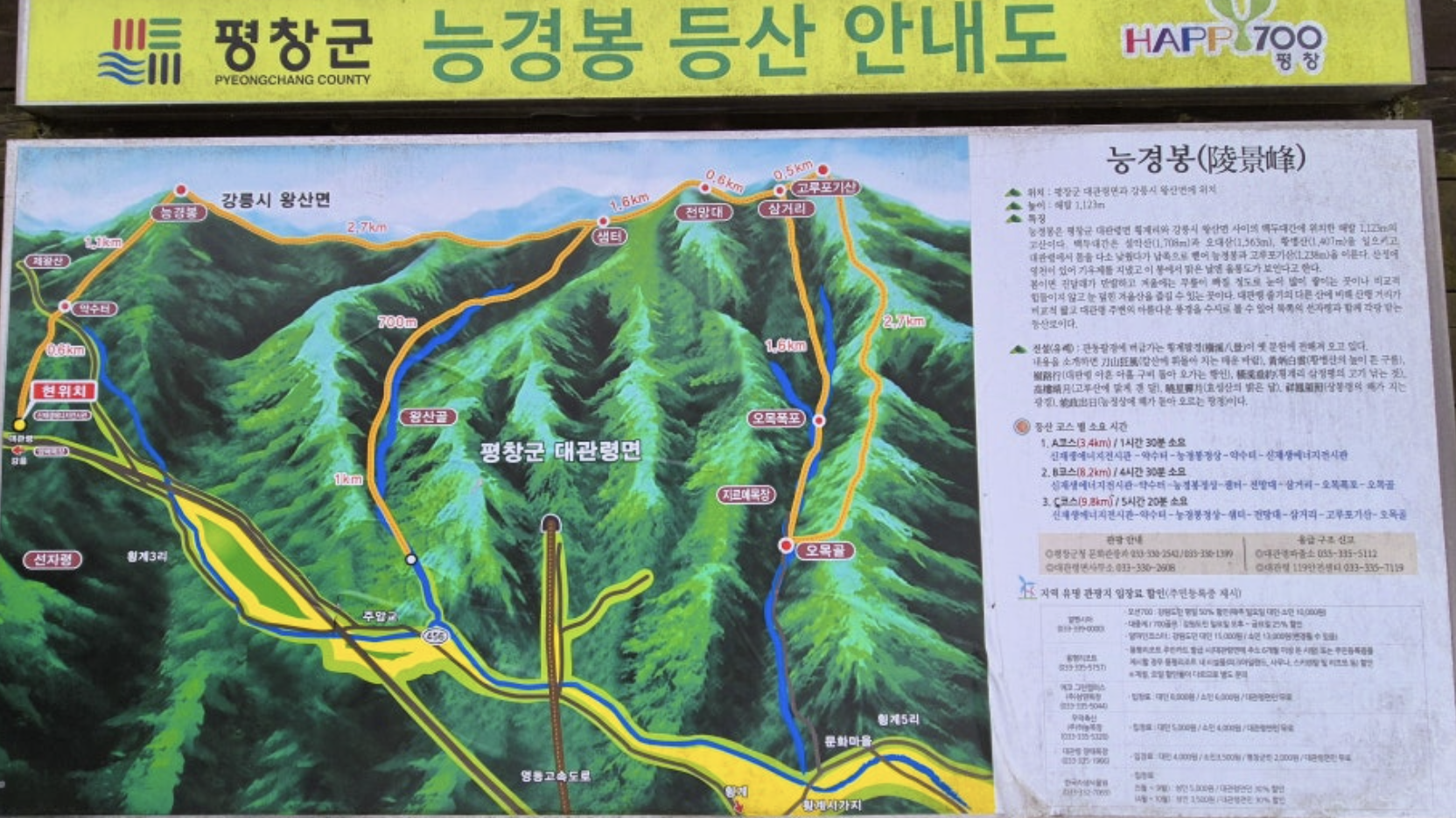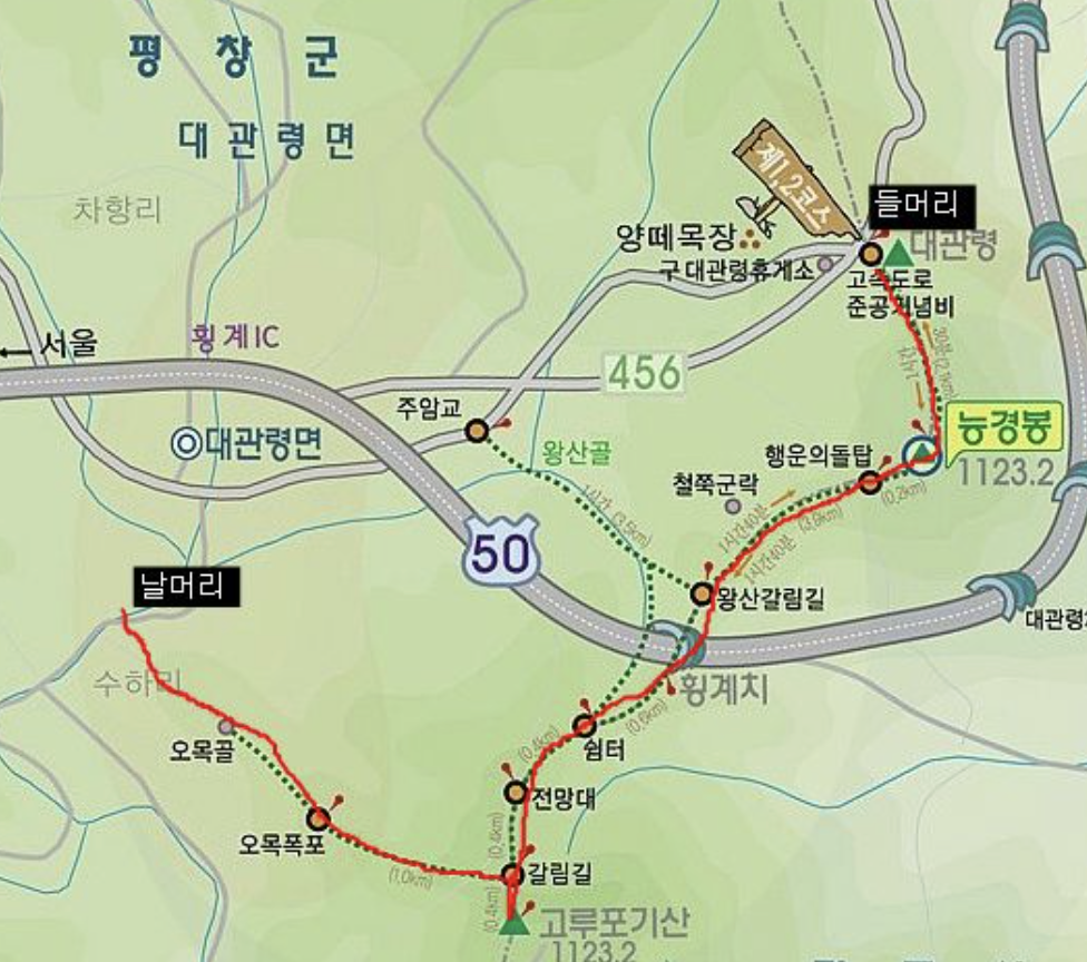 산행코스: 대관령휴게소(구)-능경봉-행운의 돌탑-전망대-오목골갈림길-고루포기(정상)-삼거리-오목폭포-오목교(약11km, 4시간 30분)