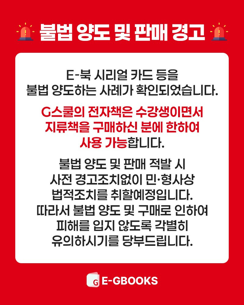 [G스쿨] E북 불법 양도 및 판매 경고 작성자gschool1|작성시간24.08.21|조회수75 목록 댓글 0 글자크기 작게가 글자크기 크게가 다음검색 현재 게시글 추가 기능 열기 북마크 공유하기 신고 센터로 신고 댓글 댓글 0 댓글쓰기 답글쓰기 댓글 리스트