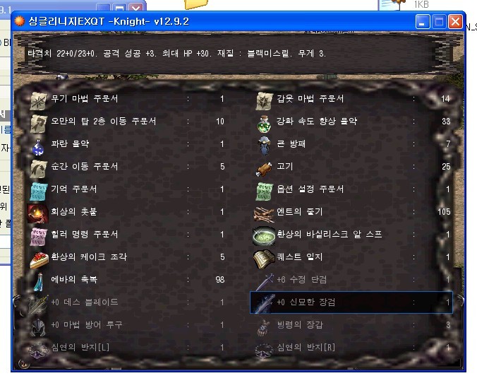 신묘검 옵션이네요 ^^; 블랙 미스릴 재질이라 1강화부터 축복받은 주문서가 필요하죠 ㅠ0ㅠ;; 일단 강화는 보류
