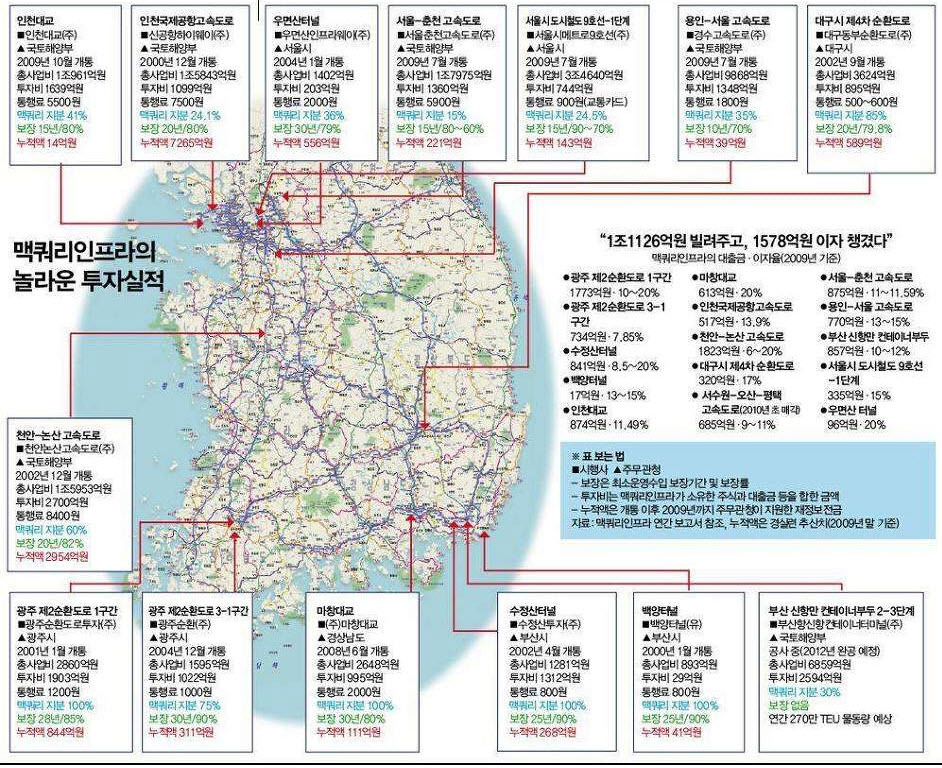대부분의 사업이 통행량 뻥튀기해서 만든 자료로 2~30년 장기계약 맺어놨고, 통행량 모자르면 정부에서 매꿔줘야 하고.