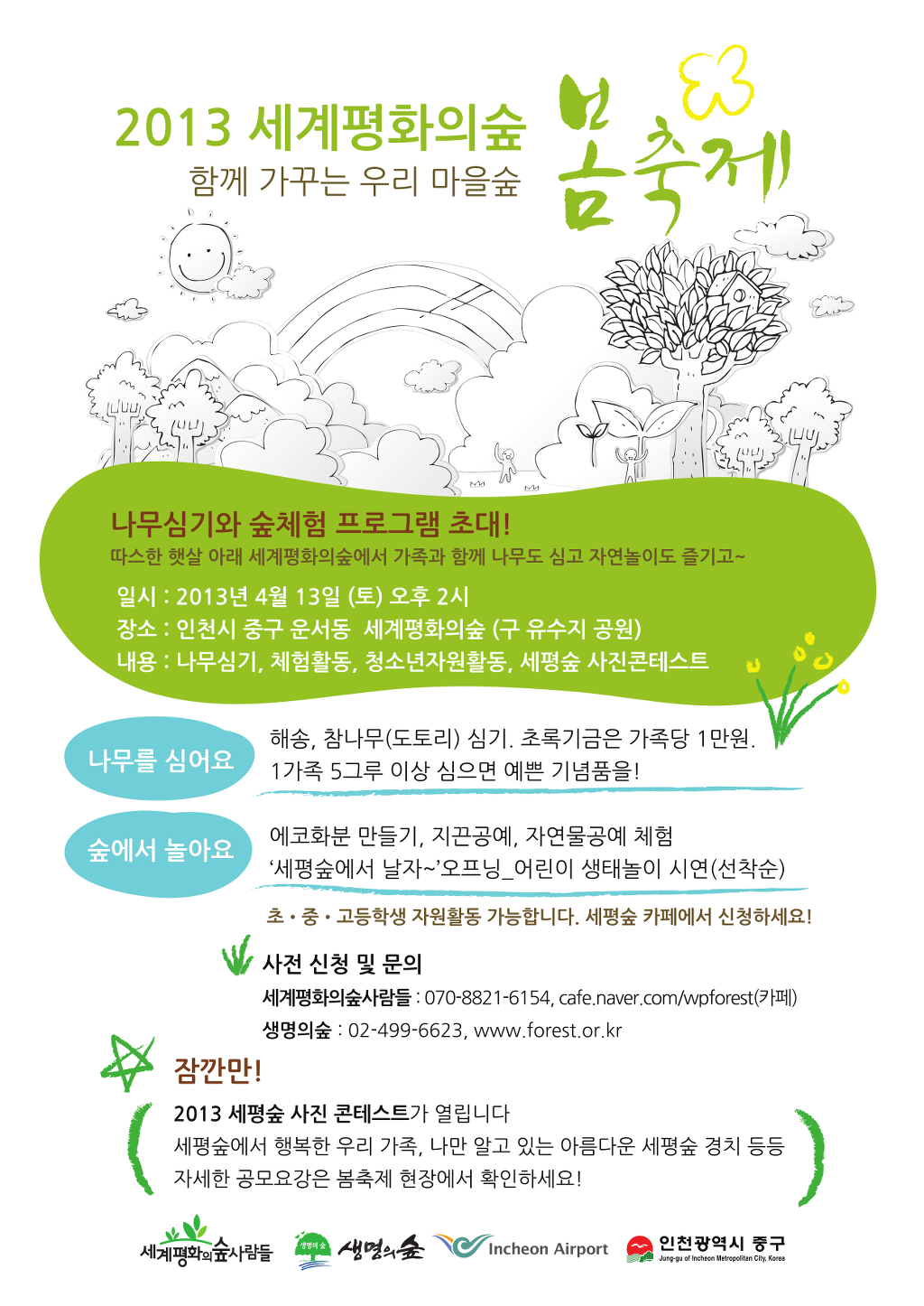 2013년 "세계 평화의 숲" 봄축제에 놀러오세요... 작성자여백|작성시간13.04.03|조회수411 목록 댓글 1 글자크기 작게가 글자크기 크게가 2013년 4월 13일 "세계평화의 숲" 봄축제 에 여러분을 초대합니다. 많은 참여와 성원 부탁드립니다.. 다음검색 현재 게시글 추가 기능 열기 북마크 공유하기 신고 센터로 신고 댓글 댓글 1 댓글쓰기 답글쓰기 댓글 리스트 작성자산다는 건 | 작성시간 13.04.08 지난 가을에도 좋왔는데, 봄에도 하는군요...가을에 받았던 화분도 예쁘게 자라고 있습니다..올 봄 축제도 기대 만빵입니다~~~토요일에 가겠습니다 댓글 전체보기