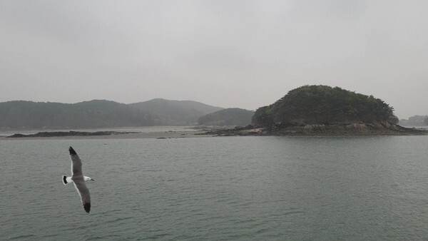 창 밖으로 보이는 신도, 시도, 모도, 떠나온 영종도의 봄 풍경이 펼쳐진다. 갈매기는 배를 따라 다니고 배는 외로워 보이는 작은 무인도를 지난다.