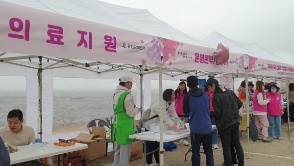 옹암해변에 마련된 행사장에 도착하였다. 미리 준비된 천막과 준비 요원들이 부산하게 움직이고 있다. 이제 배에서 내린 선발대 같은 사람들이 들어오니 제법 축제장 같은 분위기가 살아난다.