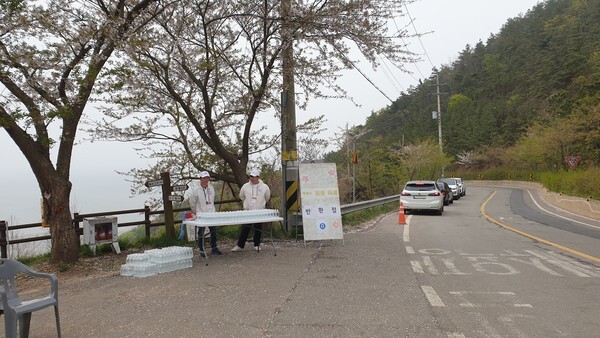 장봉도 사회복지시설인 혜림원에서 나온 지체가 부자유스러운 분들이 축제를 즐기기 위해 휠체어를 이용하여 함께 동행하였다. 전환점인 말문고개에 이르니 식수를 제공하는 행사 요원이 기다리고 있다.