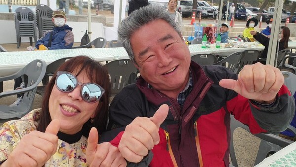 식사를 하다가 기자를 발견한 관광객 두분이 장봉도에 와서 즐거운 캠핑을 하였다고 시설 좋고 친절한 사람들이 이끌어주는 아름다운 섬이라고 여행을 권장한다고 포즈를 취해준다.