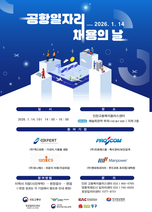 "제1회 공항일자리 채용의 날" 안내 작성자JUNGGU영종|작성시간26.01.08|조회수415 목록 댓글 2 글자크기 작게가 글자크기 크게가 다음검색 현재 게시글 추가 기능 열기 북마크 공유하기 신고 센터로 신고 댓글 댓글 2 댓글쓰기 답글쓰기 댓글 리스트 작성자따불용 | 작성시간 26.01.11 양질의.일자라가 있는것도 아니고 1년내내 구인모집하는 최저시급의 일자리들인대 과대하게.포장한다고 구인이 될까요. 저 행사비용을 차라리 구직자에게 인센으로지급한다면 활성화되지 않을까 싶네요 답댓글 작성자이거거덩 | 작성시간 26.01.26 공감합니다. 댓글 전체보기