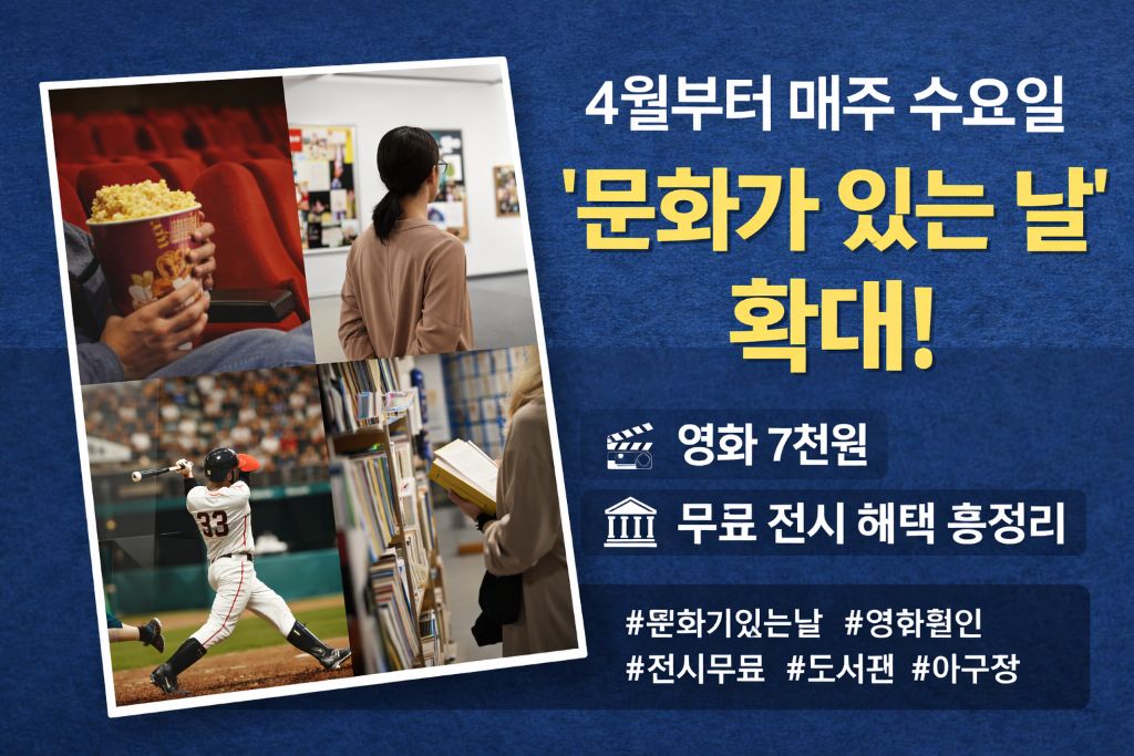 4월부터 매주 수요일 ‘문화가 있는 날’ 확대! 영화 7천원·무료 전시 혜택 작성자영종정보,소식|작성시간26.03.26|조회수52 목록 댓글 0 글자크기 작게가 글자크기 크게가 4월부터 매주 수요일 ‘문화가 있는 날’ 확대! 영화 7천원·무료 전시 혜택https://naver.me/5UVjAHJP4월부터 매주 수요일 ‘문화가 있는 날’ 확대! 영화 7천원·무료 전시 혜택 총정리📅 ‘문화가 있는 날’ 어떻게 바뀌나? 기존에는 매월 마지막 주 수요일에만 운영되던 ‘문화가 있는 날...blog.naver.com 다음검색 현재 게시글 추가 기능 열기 북마크 공유하기 신고 센터로 신고 댓글 댓글 0 댓글쓰기 답글쓰기 댓글 리스트