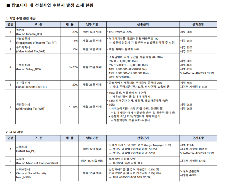 "캄보디아 내 건설사업 사업 수행시 발생 조세 현황" 자료 입니다.