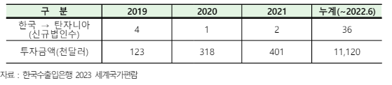 2) 한국-탄자니아 간 투자현황 (단위:천달러)