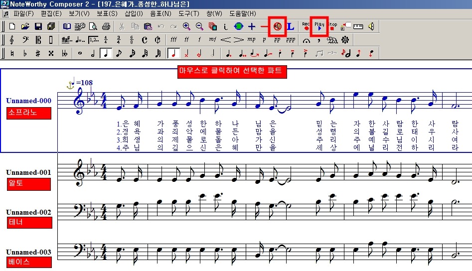 hift + F5 키를 누르시면 선택한 파트만 연주됩니다.파트별 악보는 위에서부터 소프라노, 알토, 테너, 베이스 순서로 표시됩니다.