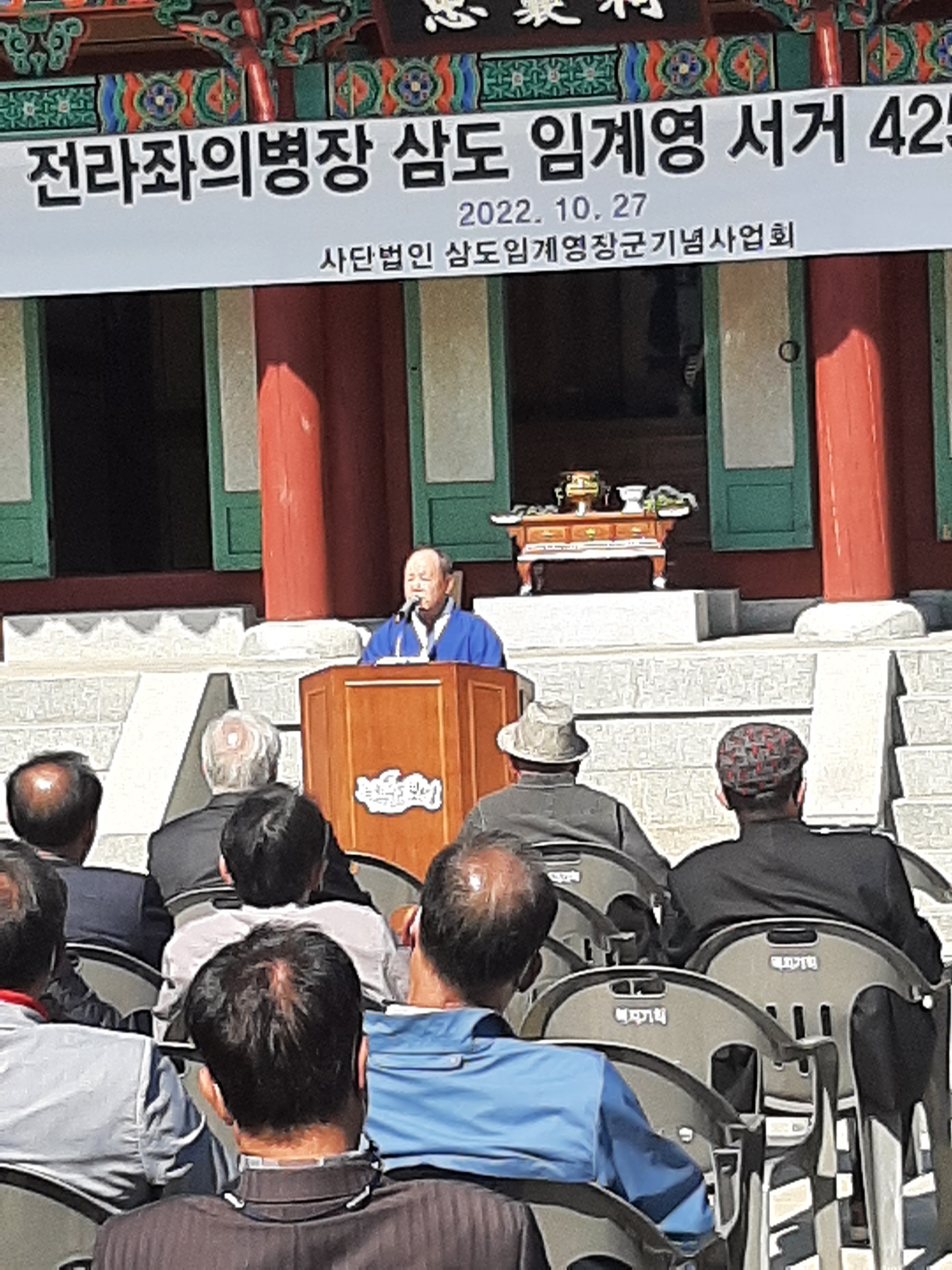 삼도 임계영 장군님 추도식 작성자봉황동|작성시간22.11.02|조회수97 목록 댓글 0 글자크기 작게가 글자크기 크게가 삼도 임계영 장군님 425주기 추도식과 충양사 준공식에 다녀 왔습니다. 대종회 임 기주 종친회장님 축사 중이십니다. 다음검색 현재 게시글 추가 기능 열기 북마크 공유하기 신고 센터로 신고 댓글 댓글 0 댓글쓰기 답글쓰기 댓글 리스트