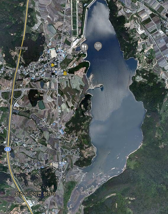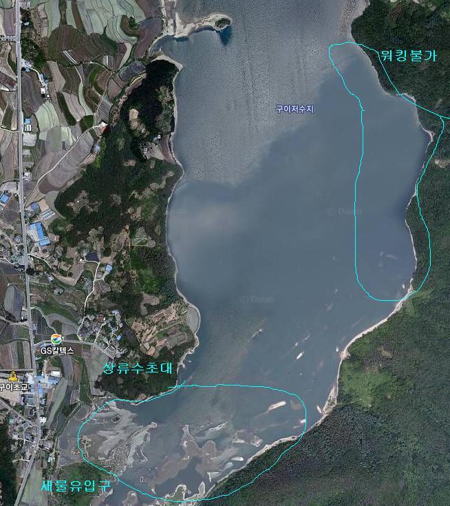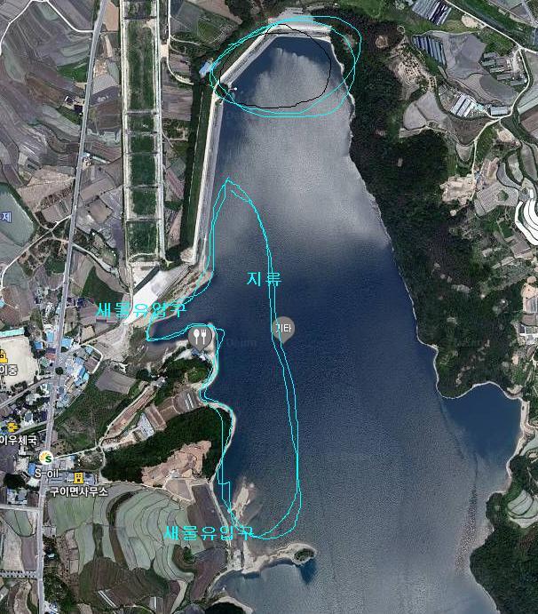 애매하였으나 위성사진인관계로 바닥지형이나 새물유입구등을 참고하여