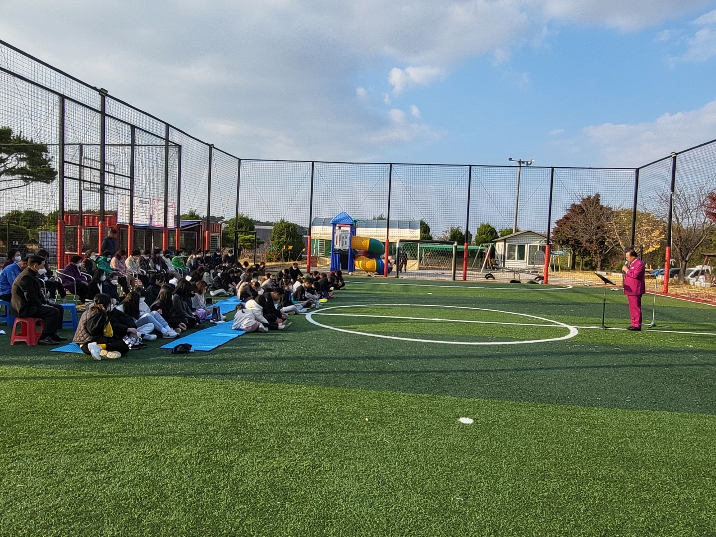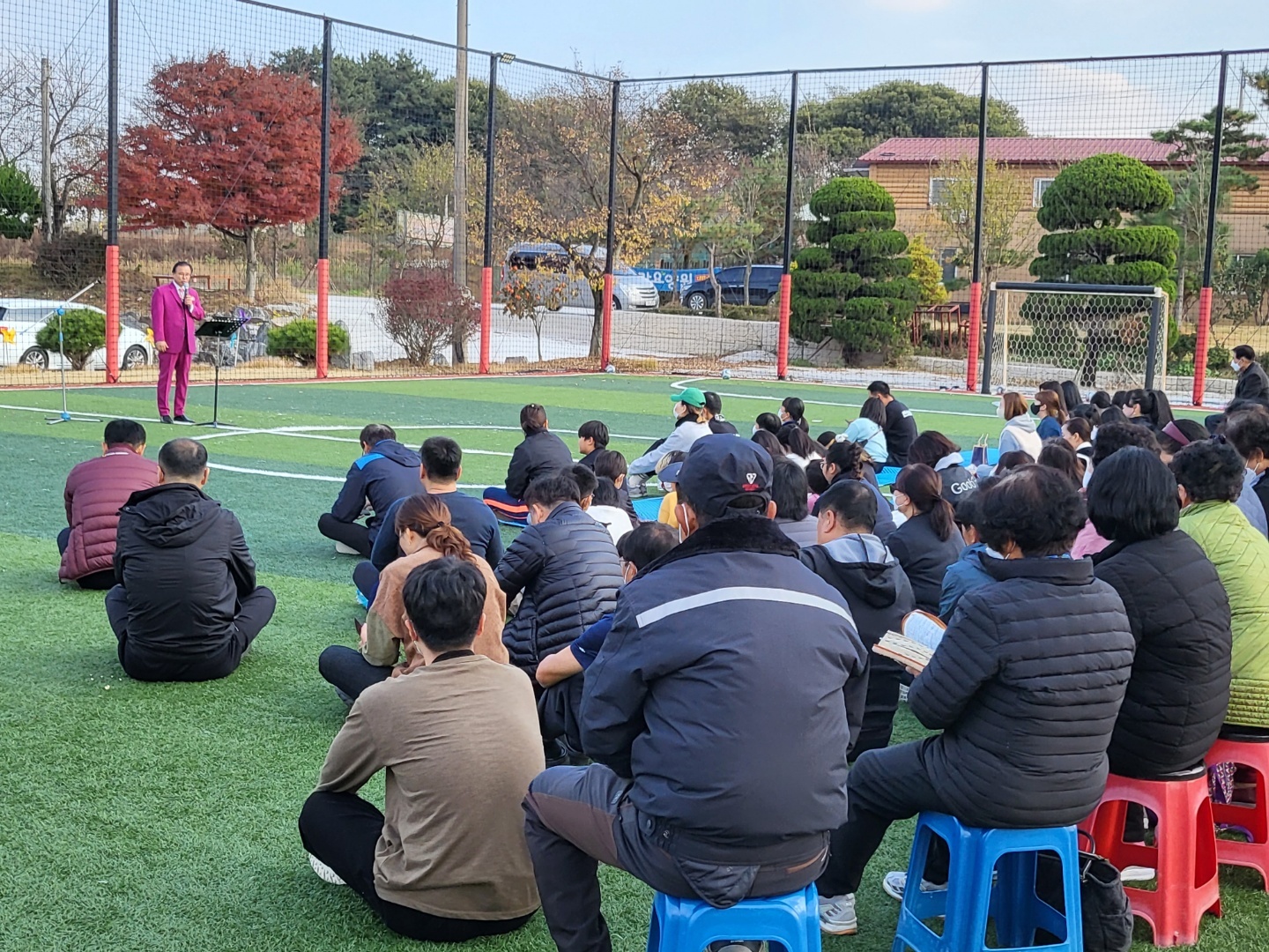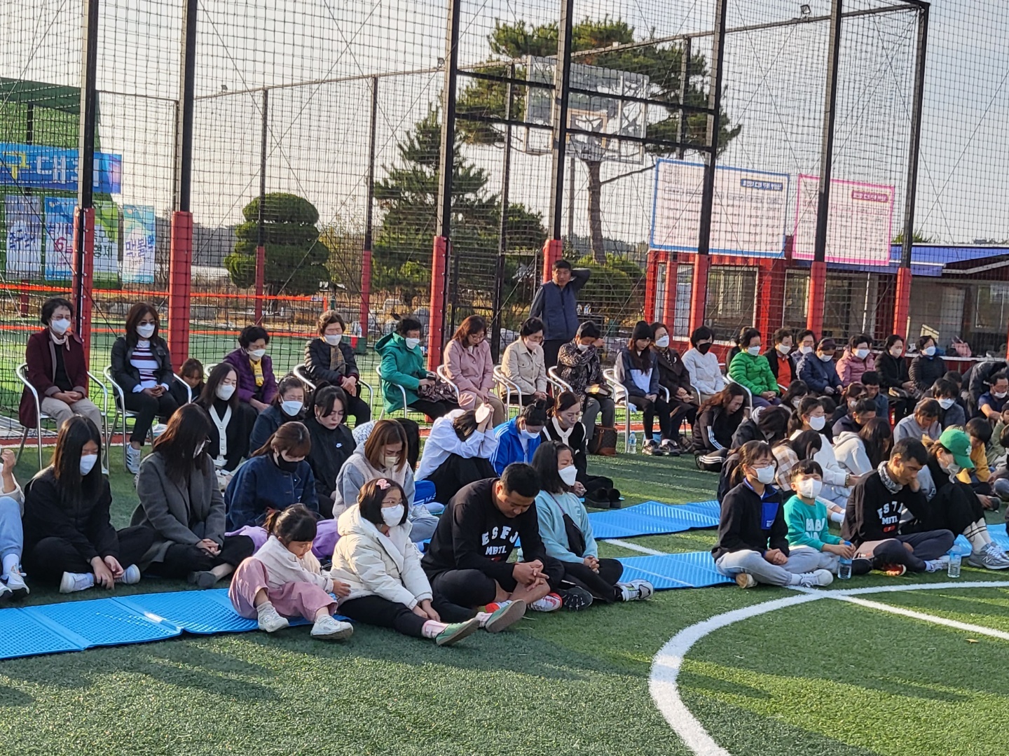 풋살장에서의 전교인 야외예배