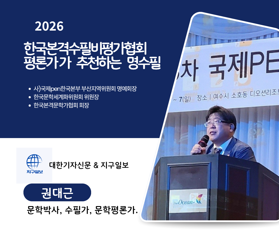 평론가가 추천하는 명수필, 권대근 교수[포스터] 작성자저산|작성시간25.12.14|조회수34 목록 댓글 0 글자크기 작게가 글자크기 크게가 다음검색 현재 게시글 추가 기능 열기 북마크 공유하기 신고 센터로 신고 댓글 댓글 0 댓글쓰기 답글쓰기 댓글 리스트