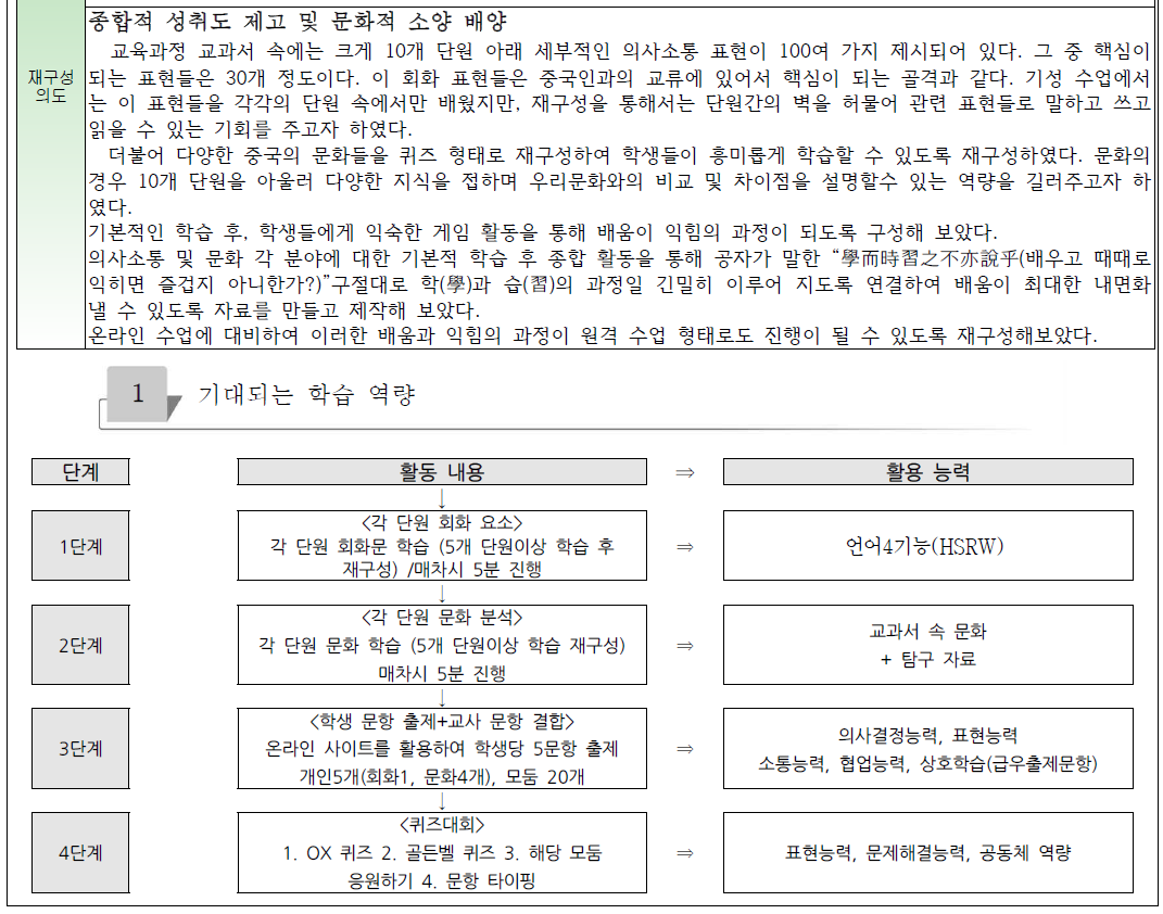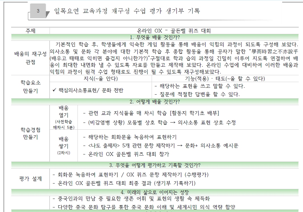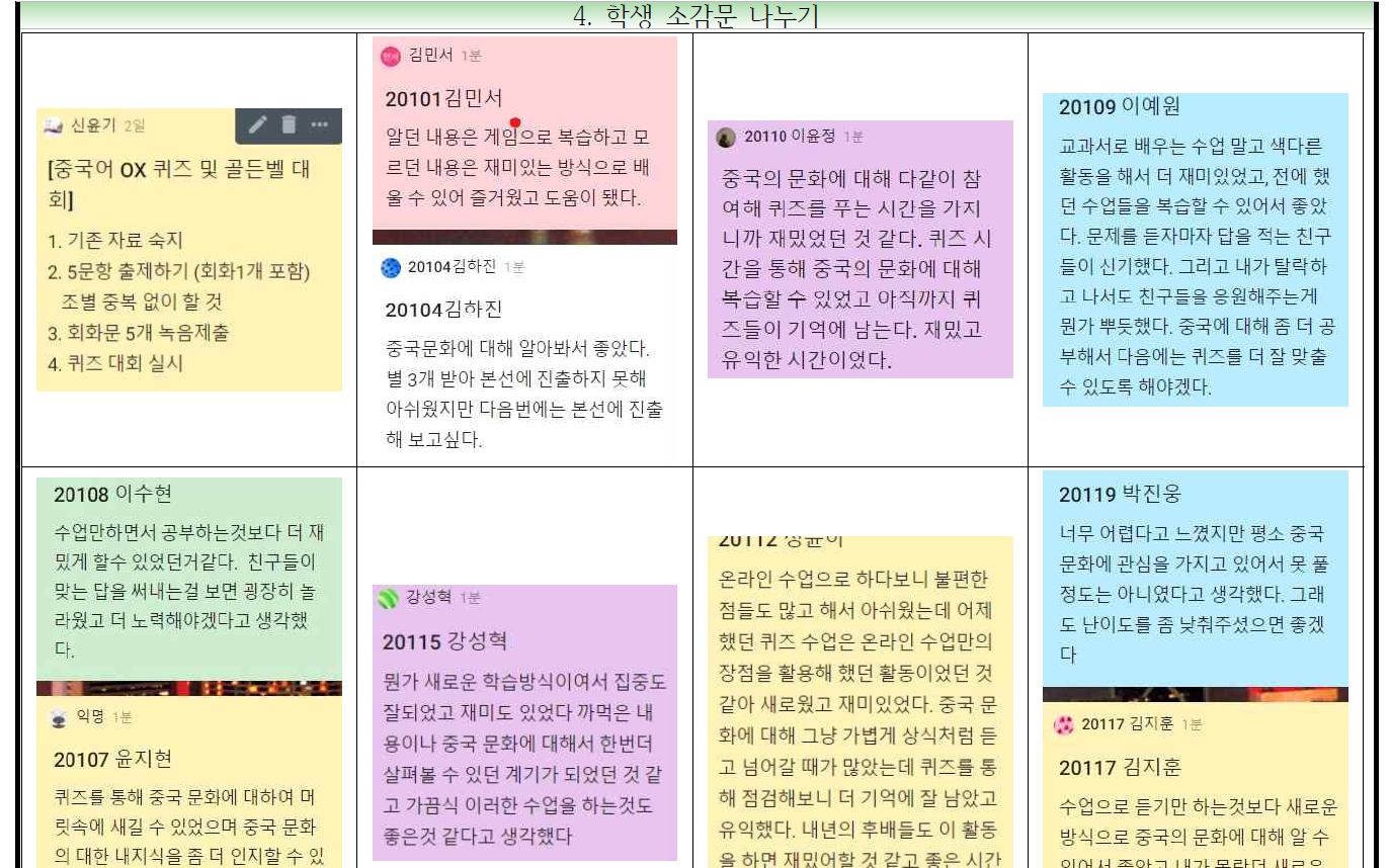 답댓글 작성자신윤기 분당고 성남 제2외국어(중국 작성자 본인 여부 작성자 작성시간 21.03.30 수업 자체를 평가까지 연결하는 것을 강조하니, 학생들이 좀 더 정리차리고 적극 참여한 부분이 있습니다. 영어 말하기는 더 열정적으로 학생들이 참여할 듯 합니다. ^^