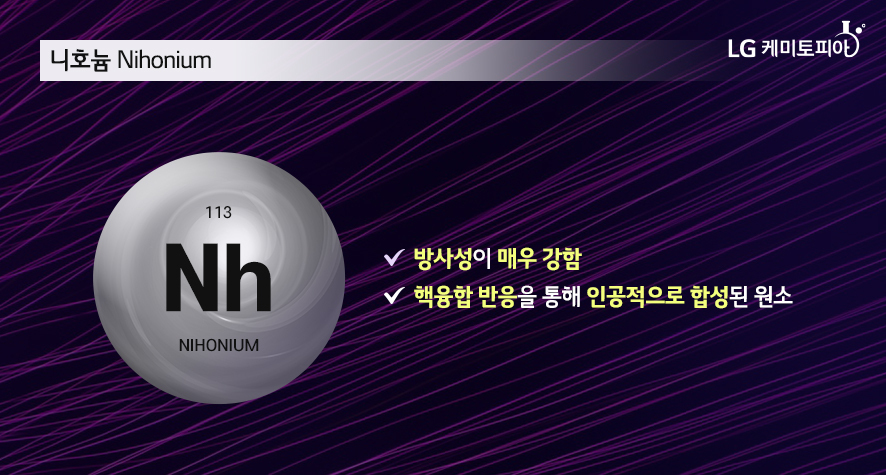‘니호늄(Nh, 원자번호 113번)’은 핵융합 반응을 통해 인공적으로 합성된 원소 입니다. 방사성이 매우 강한 니호늄(nihonium)은 한번에 단지 원자 몇 개만 얻어지고 반감기도 아주 짧기 때문에 방사성 붕괴 이외의 성질은 아직 측정되지 않았습니다. 이론적 계산으로 알려진 바에 의하면 다른 13족 원소들과 대체로 비슷하며, 어느 정도 전이금속의 특성도 보일 것으로 예측되고 있습니다.