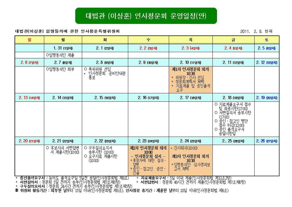 대법관 이상훈(49회) 인사청문회(2월23) 작성자박용현(11)|작성시간11.02.15|조회수82 목록 댓글 0 글자크기 작게가 글자크기 크게가 대법관(이상훈) 인사청문회 운영일정(달력식.hwp 첨부파일첨부된 파일이 2개 있습니다. jpg 파일 대법관청문회일정001.jpg 다운로드 hwp 파일 대법관(이상훈) 인사청문회 운영일정(달력식.hwp 다운로드 다음검색 현재 게시글 추가 기능 열기 북마크 공유하기 신고 센터로 신고 댓글 댓글 0 댓글쓰기 답글쓰기 댓글 리스트