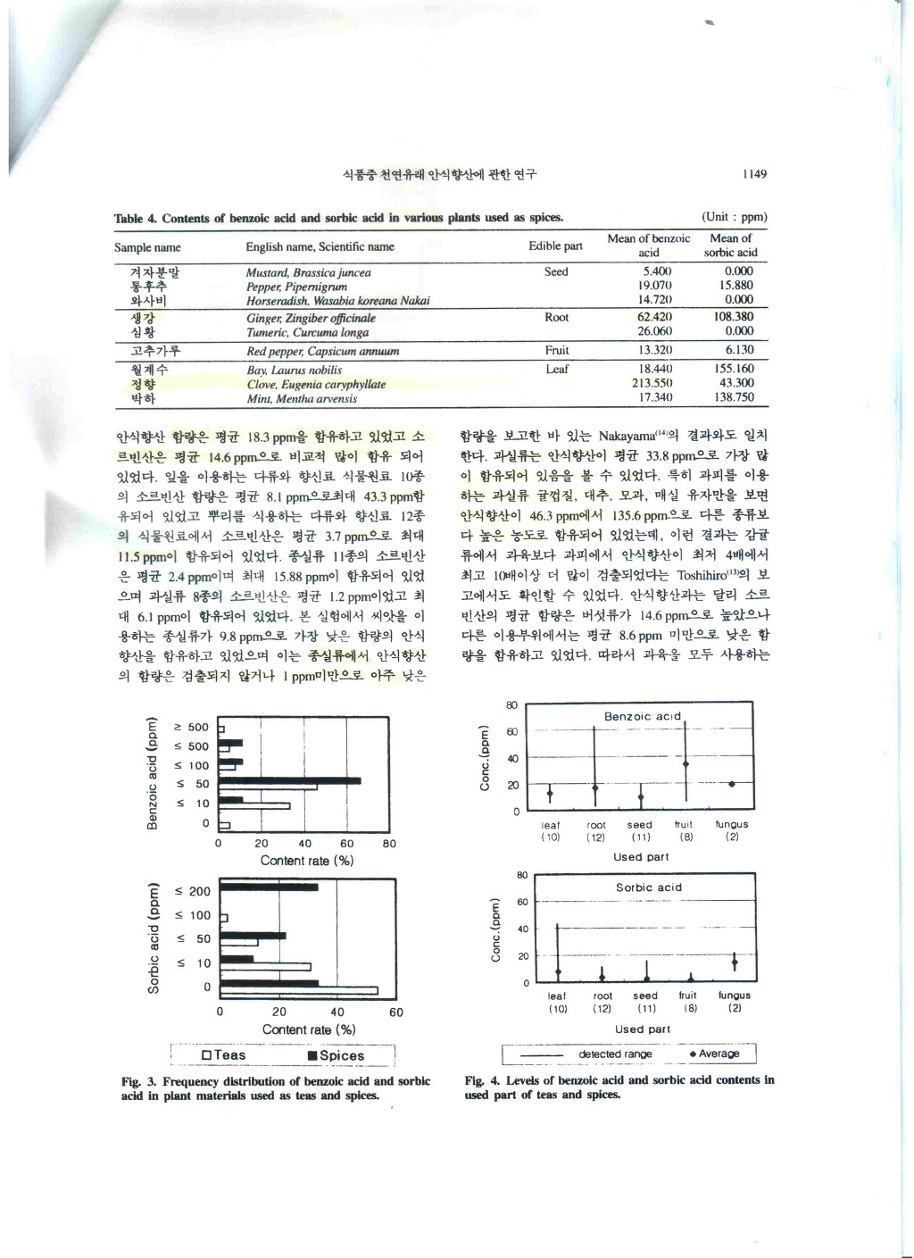월계수(잎) 155.160ppm, 박하(잎) 138.750ppm, 생강(뿌리) 108.380ppm,