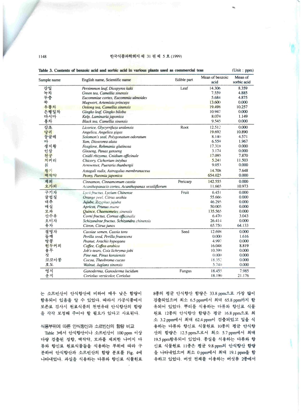천연식품(식물)의 안식향산 및 소르빈산 함유량