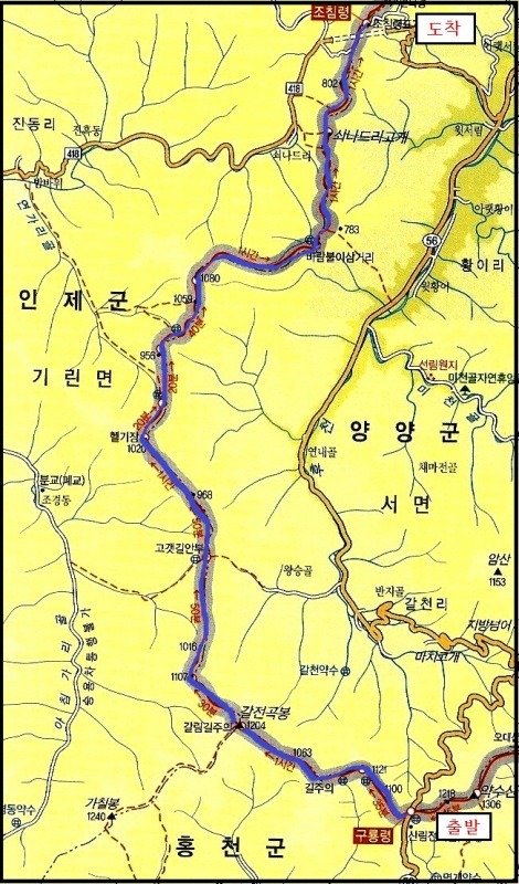 2. 산행코스 : 구룡령-갈전곡봉-968봉-연내골샘터-바람불이-쇠나들이재-조침령
