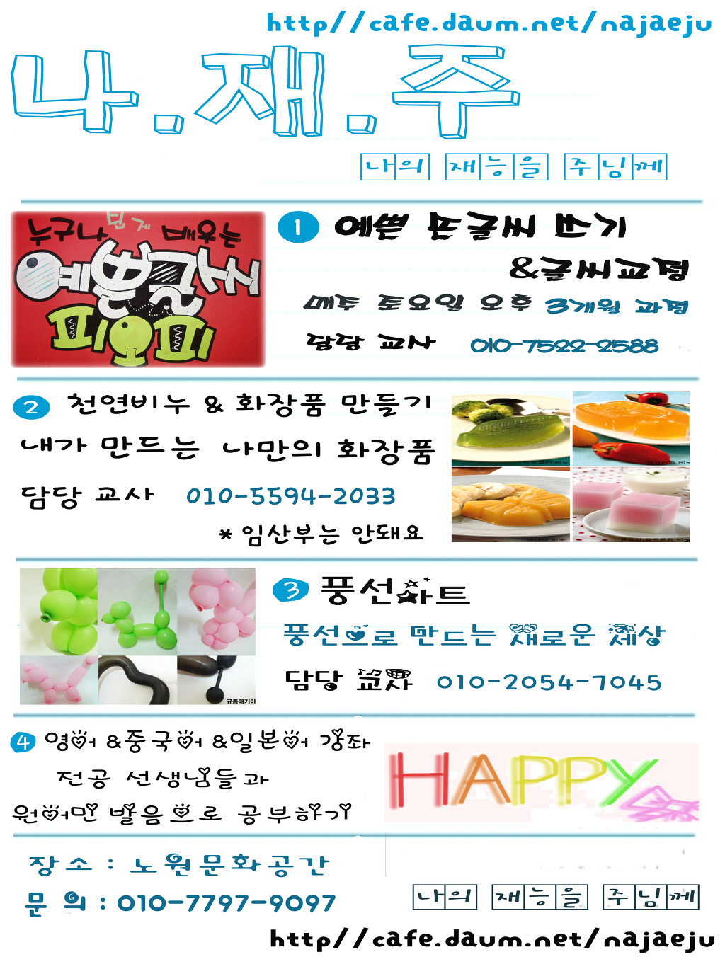 pop,영어,중국어,일어,천연화장품,비누,풍선아트 배우고 싶은사람~^^ 작성자홍보석녹보석|작성시간10.07.22|조회수109 목록 댓글 0 글자크기 작게가 글자크기 크게가 pop,영어,중국어,일어,천연화장품,비누,풍선아트 배우고 싶은사람~^^ 다음검색 현재 게시글 추가 기능 열기 북마크 공유하기 신고 센터로 신고 댓글 댓글 0 댓글쓰기 답글쓰기 댓글 리스트