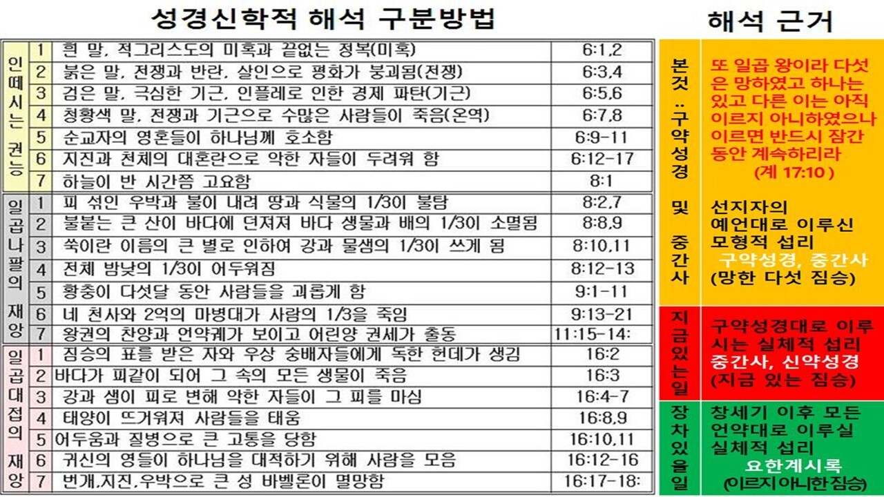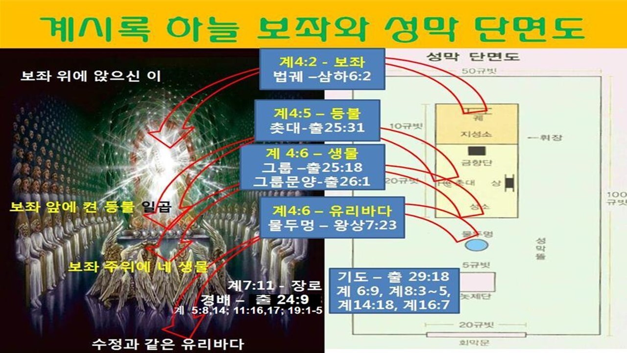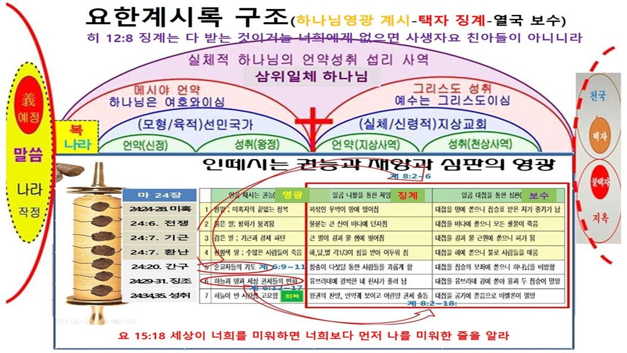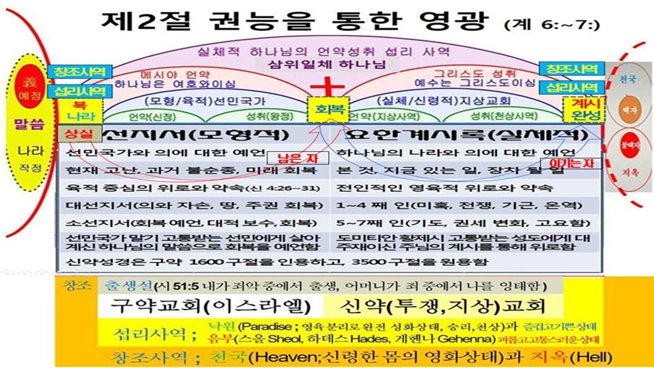| 제3부 새 하늘과 새땅의 내림 (요한 계시록) 요한계시록은 천상에서 교회를 견인하시는 예수 그리스도의 영광의 모습과 모든 음부의 권세를 멸하시고 새 하늘과 새 땅을 내리시는 내용이다. 도미시아누스황제는 치세 말기에 "주님이요 하나님" (Dominus et Deus)으로 자처하면서, 황제 숭배를 강요했고, 이를 배척하는 유대교인들과 그리스도인들을 박해했다. 특히 로마와 에베소에는 웅장한 황제 신전을 짓고 참배를 강요당하는 등 박해 가운데 있는 교회에게 요한은 ‘하나님의 나라’에 대한 약속을 받고 ‘하나님의 의’의 영광을 보여 주시며 ‘하나님의 나라’를 성취하시는 계시 내용을 에베소 일대 일곱 교회로 편지를 보내어, 그리스도의 신앙을 온전히, 그리고 굳세게 지키라고 촉구했다. 이는 구약성경에서 선민국가의 회복에 대해 예언했던 선지자들처럼 지상교회의 환란은 첫째 아담 이후 사단의 권세 아래 매인 까닭임을 증거하며 남은 약속인 새 하늘과 새 땅의 내림에 대해 증거하시는 계시 섭리이다. | |