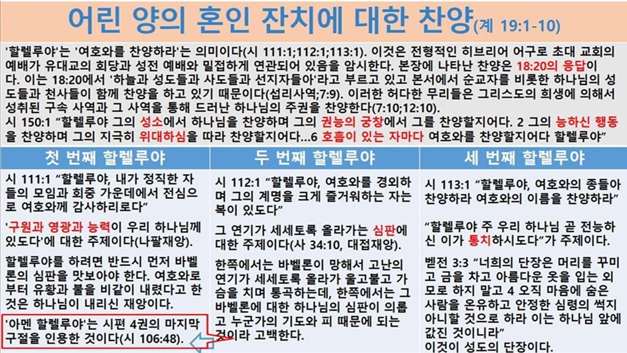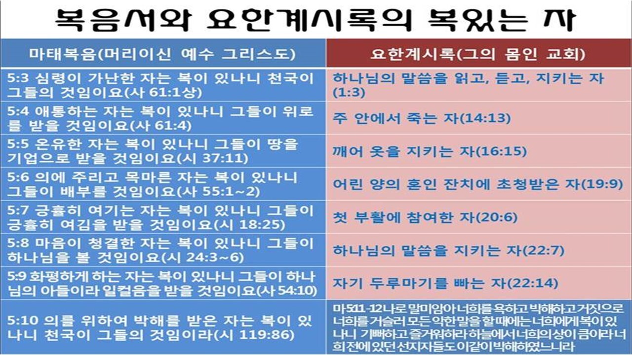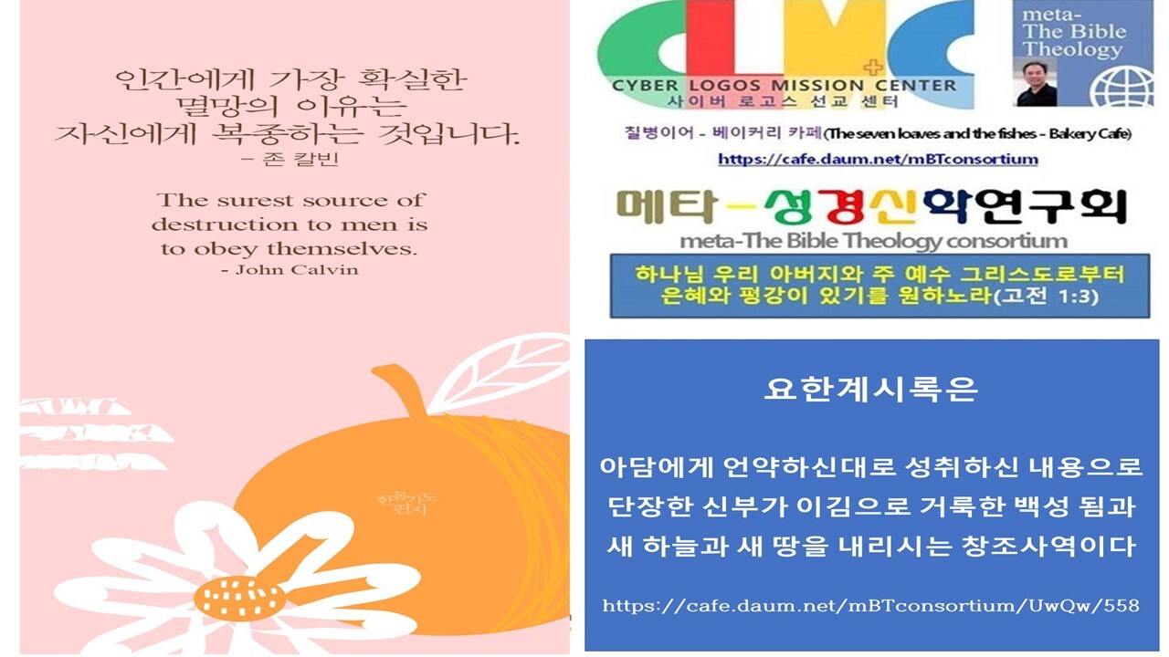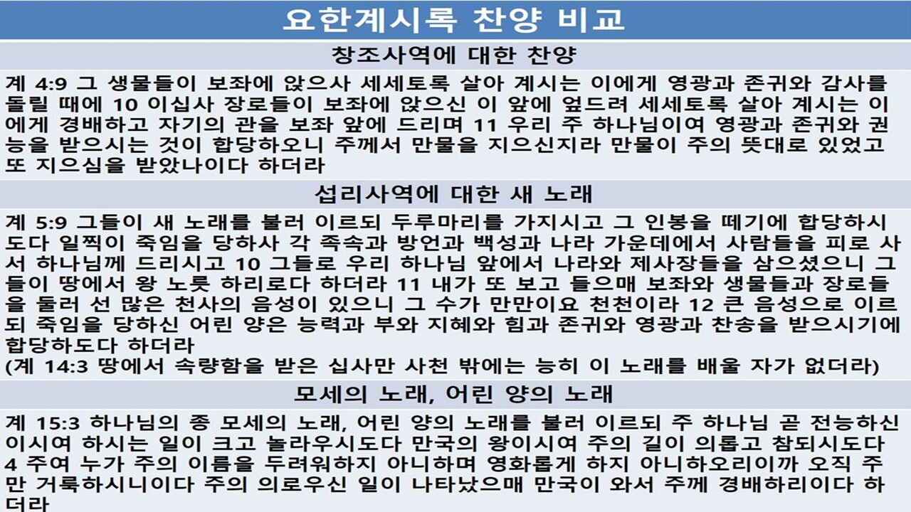 | 11월 둘째 주는 마지막 날의 대환란과 그리스도의 승리를 전하는 '요한계시록'을 함께 통독할 수 있도록, 말씀을 읽고 동시에 들을 수 있는 [자막병행] 유튜브로 보내드립니다. [요한계시록 통독하기 https://youtu.be/fH7fBZrVGlI 요한계시록은 A.D. 95~96 년경 밧모섬에 유배되었던 사도요한이 기록한 것으로 하나님의 구원 계획의 성취와 세상을 심판하고 의로 통치하실 예수님을 환상과 상징으로 전하고 있습니다. 79분이 소요되는 요한계시록을 통독하며 이 땅에서의 모든 시험과 고통을 이겨낼 힘을 얻으시길 축복합니다. 우리 주님 다시 오십니다! 개요 1 https://youtu.be/ue4ZFykrMJ8 개요 2 https://youtu.be/TV36boVNZOk 요한계시록 [Revelation of John] 신약성경에 포함된 단 한 권의 묵시록으로 신약성경의 맨 마지막에 실려 있는 책이다. 신약성경이 그리스도의 초림과 관련된 네 복음서로 시작되고 있는 것과 마찬가지로 요한계시록은 그리스도의 재림이라는 주제로 신약성경을 마감하고 있다. 요한계시록은 또한 신구약을 통하여 흐르고 있는 계시의 많은 흐름들의 절정을 이룰 뿐 아니라 또한 아직 성취되어야 할 많은 예언들의 계시에 대한 결론을 제공해 준다. 그리스도의 재림과 그에 앞서 이루어질 몇 년 간의 일들이 요한계시록에서는 성경의 어떤 다른 책보다 더 사실적으로 드러나 있다. 181장, '부활 승천하신 주께서' (재림) https://youtu.be/NIQDZ8Ved7E |