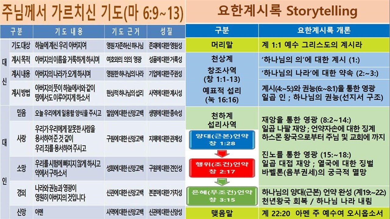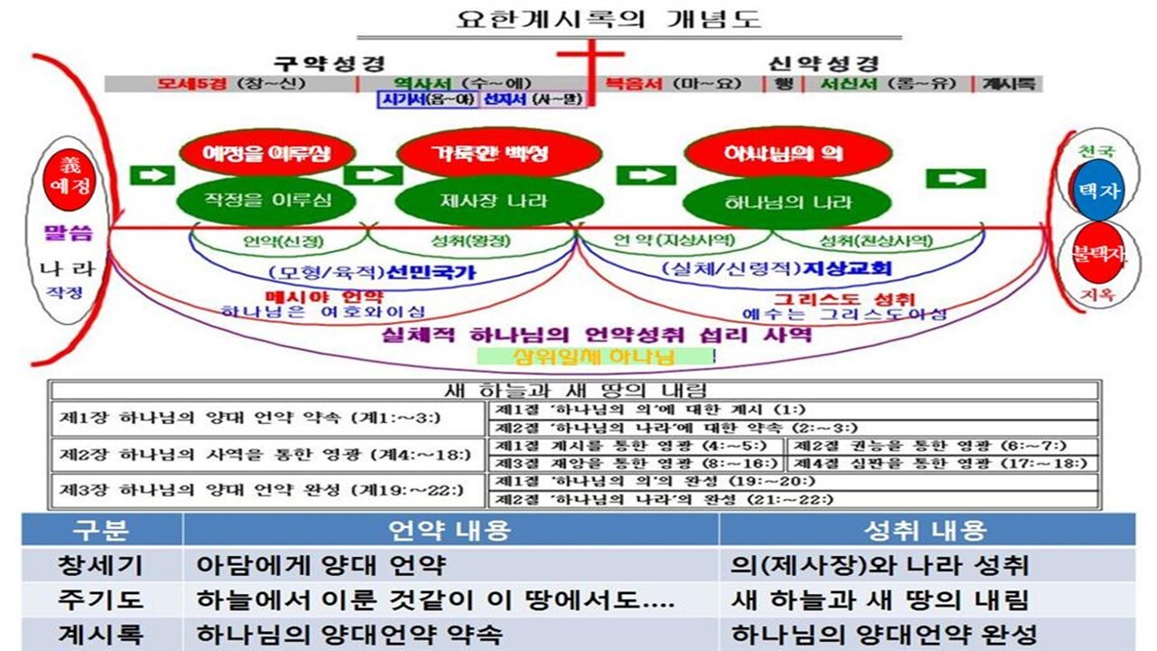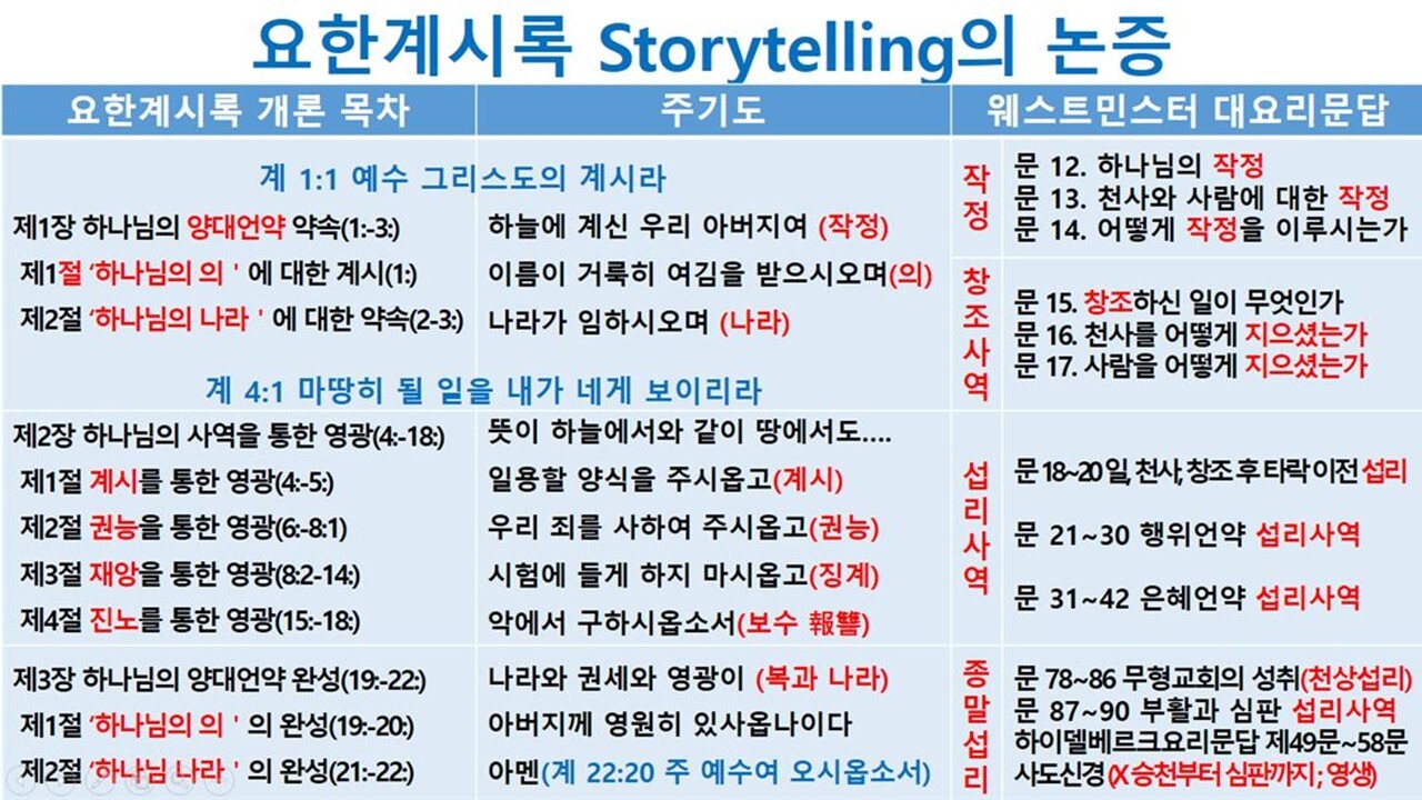 제1장 하나님의 양대 언약 약속(계1:∼3:) 제1절 ‘하나님의 의’에 대한 계시 (1:) 1. 소명 (1~8) 2. 예수 그리스도의 환상 (9~16) 3. 계시의 내용 (17~20) 제2절 ‘하나님의 나라’에 대한 약속 (2:∼3:) 1. 에베소 교회에 대한 약속 (2:1∼7) 2. 서머나 교회에 대한 약속 (8∼11) 3. 버가모 교회에 대한 약속 (12∼17) 4. 두아디라 교회에 대한 약속 (18∼29) 5. 사데 교회에 대한 약속 (3:1∼6) 6. 빌라델비아 교회에 대한 약속 (7∼13) 7. 라오디게아 교회에 대한 약속 (14∼22) 제2장 하나님의 사역을 통한 영광(계4:∼18:) 제1절 계시를 통한 영광 (4:∼5:) 1. 하늘 보좌 (4;) 2. 일곱 인으로 봉한 책 (5:) 제2절 권능을 통한 영광 (6:∼8:1) 1. 여섯 인의 권능 (6:) 2. 인 맞은 자의 수 (7:~8:1) | 제3절 재앙을 통한 영광 (8:2∼14:) 1. 여섯 나팔 재앙 (8:2∼11:14) 1) 심판 선고와 네 나팔 재앙 (8:2-13) (1) 심판 선고 (1~5) (2) 네 나팔의 재앙 (6~13) 2) 화를 통한 재앙 (9:∼11:14) (1) 첫 번째 화의 재앙 (9:1∼12) (2) 두 번째 화의 재앙 (9:13∼11:14) 2. 일곱째 나팔 재앙 (11:15∼14:) 1) 큰 음성과 큰 이적 (11:15∼12:17) 2) 짐승 권세들의 출현 (13:) 3) 어린양 권세의 출동 (14:) 제4절 진노를 통한 영광 (15:∼18:) 1. 일곱 대접 재앙 (15:∼16:) 2. 음녀와 짐승의 사역 (17:) 3. 바벨론의 멸망 (18:) 제3장 하나님의 양대 언약 완성(계19:∼22:) 제1절 '하나님의 의'의 완성 (19:∼20:) 1. 어린 양의 혼인 잔치 (19:1∼10) 2. 짐승과 거짓 선지자의 멸망 (19:11∼20:) 제2절 ‘하나님의 나라’의 완성 (21:∼22:) 1. ‘하나님의 나라’의 내림 (21:1∼8) 2. ‘하나님의 나라’의 모습 (21:9∼22:5) 3. 마지막 예언과 약속 (22:6∼21) |