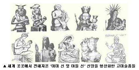 더군다나, 고대의 중국인들은 아들 신을 안고 있는 어미 여신을 ‘싱무’(Shingmoo)라고 불렀는데 그 의미는 거룩한 어머니, 곧 성모(聖母)입니다. 또한 드루이드 교도들은 어미 여신 비르가 파티튜라(Virga-Patitura)를 ‘하나님의 어머니’로 숭배했습니다. 이집트의 어미신 이시스(Isis)의 별칭 역시 ‘하나님의 어머니’였다고 합니다. 그리고 이스라엘 백성들이 타락하여 섬겼던 아스다롯(아세라)의 별칭은 ‘하늘의 여왕(모후)’이었습니다.