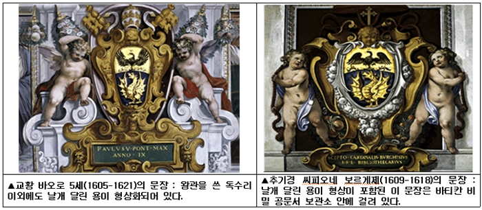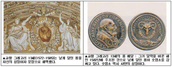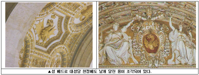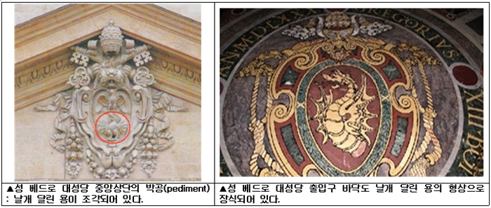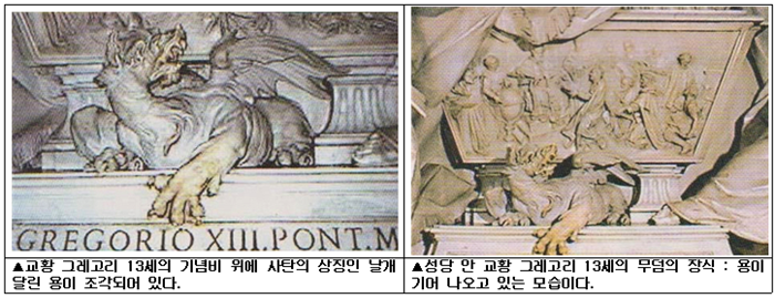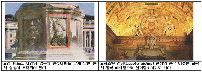 문제는 또 있습니다. 바티칸의 수많은 건축물과 구조물 가운데 사탄을 상징하는 용(뱀)의 상징이 난무한다는 사실입니다. 독수리는 기독교 안에서도 선지자를 상징하는 등의 긍정적인 의미도 가지고 있습니다. 하지만 용의 경우에는 사탄의 트레이드마크입니다. 성경이 강조하는 것처럼 모양이라도 버려야할 가장 대표적인 상징이 바로 용입니다. 태양신이 사탄을 가리키듯 용도 사탄을 가리킵니다. 그런데 놀랍게도 역사상 수많은 교황과 추기경의 문장이나 무덤 등에서 날개달린 용의 문장을 아주 광범위하게 찾아볼 수 있습니다.
