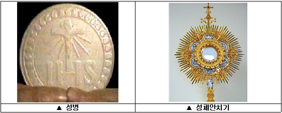 위의 그림을 통해서 확인할 수 있듯이 성병과 짝을 이루는 성체안치기(monstrance) 역시 태양원반의 형태를 하고 있을 뿐만 아니라 태양에서 발산되는 햇살을 연상시키는 문양으로 꾸며져 있습니다. 성체(Host)란 화체설(化體說)에 근거하여 그리스도의 몸으로 변화된 성병을 구별하여 지칭하는 단어입니다. 미사를 집전하는 사제는 소위 성체로 변화된 성병을 성체안치기에 올려놓습니다. 그러면 미사에 참여한 신도들은 그것을 하나님으로 여기고 숭배합니다. 마치 모세가 자리를 비운 사이 아론이 만든 황금송아지를 하나님이라고 부르며 숭배하던 이스라엘 백성들을 연상시키지 않습니까?