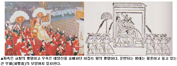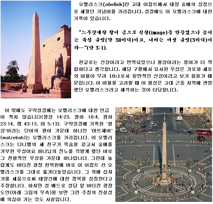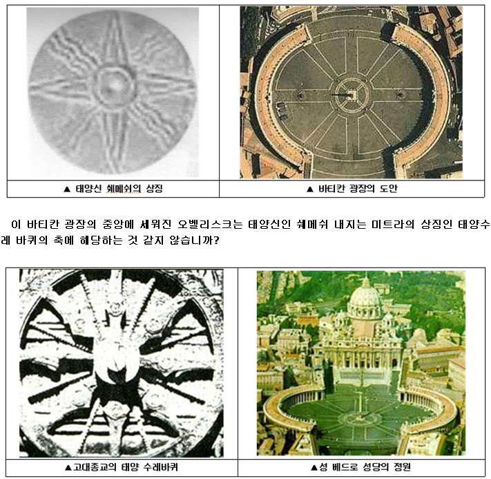 정녕 이 모든 것이 다 우연이란 말입니까? 어떤 의도도 담겨있지 않단 말입니까? 진화론의 터무니없는 거짓말처럼 저절로 생겨난 것도 아니고 모든 것이 교황청의 지시에 따라 체계적으로 설계되고 오랜 기간 동안 많은 비용을 들여 만든 건축물과 구조물의 문양들이 아무런 의미도 없이 그냥 지어졌단 말입니까? 그것은 있을 수 없는 일입니다. 특정한 의도를 가지고 만들어진 것이 분명합니다. 그런데 성경에서는 그 근거를 전혀 찾을 수 없습니다. 그 대신, 이집트를 비롯하여 바벨론 문명의 영향을 받은 태양신 숭배 계열의 종교들에서는 그것과 거의 흡사한 문양들이 사용되고 있습니다. [Thomas Imman, Ancient Pagan And Modern Christian Symbolism (Bristol, 1874), 34.]