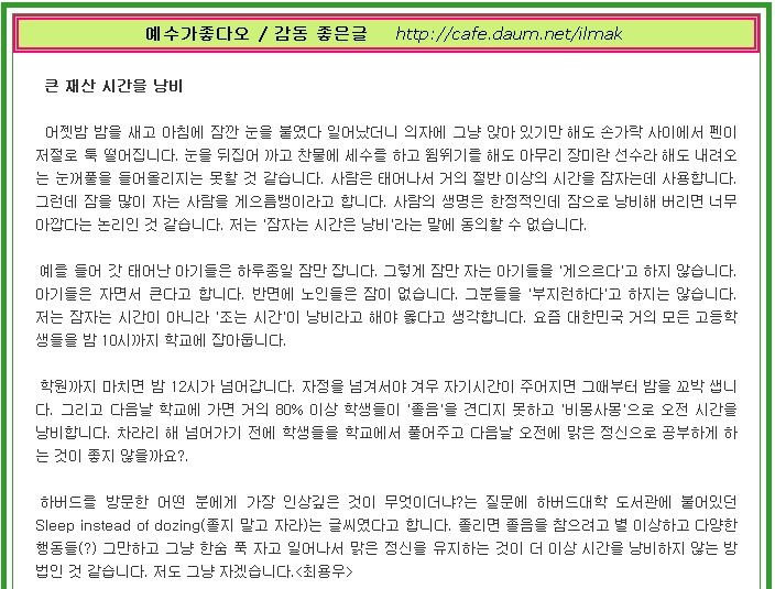 큰 재산 시간 낭비 작성자(일맥)|작성시간12.06.15|조회수614 목록 댓글 21 글자크기 작게가 글자크기 크게가 ☞예수가좋다오 다음검색 현재 게시글 추가 기능 열기 북마크 공유하기 신고 센터로 신고 댓글 댓글 21 댓글쓰기 답글쓰기 댓글 리스트 작성자love is | 작성시간 18.05.16 좋은 글 감사합니다. 작성자love is | 작성시간 18.05.16 좋은 글 감사합니다. 작성자Mother of love | 작성시간 18.10.28 잘 읽고 갑니다. 감사합니다. 작성자별이야 운영자 | 작성시간 19.06.06 좋은 글 감사합니다. 작성자haidy | 작성시간 22.05.02 감사합니다 댓글 전체보기