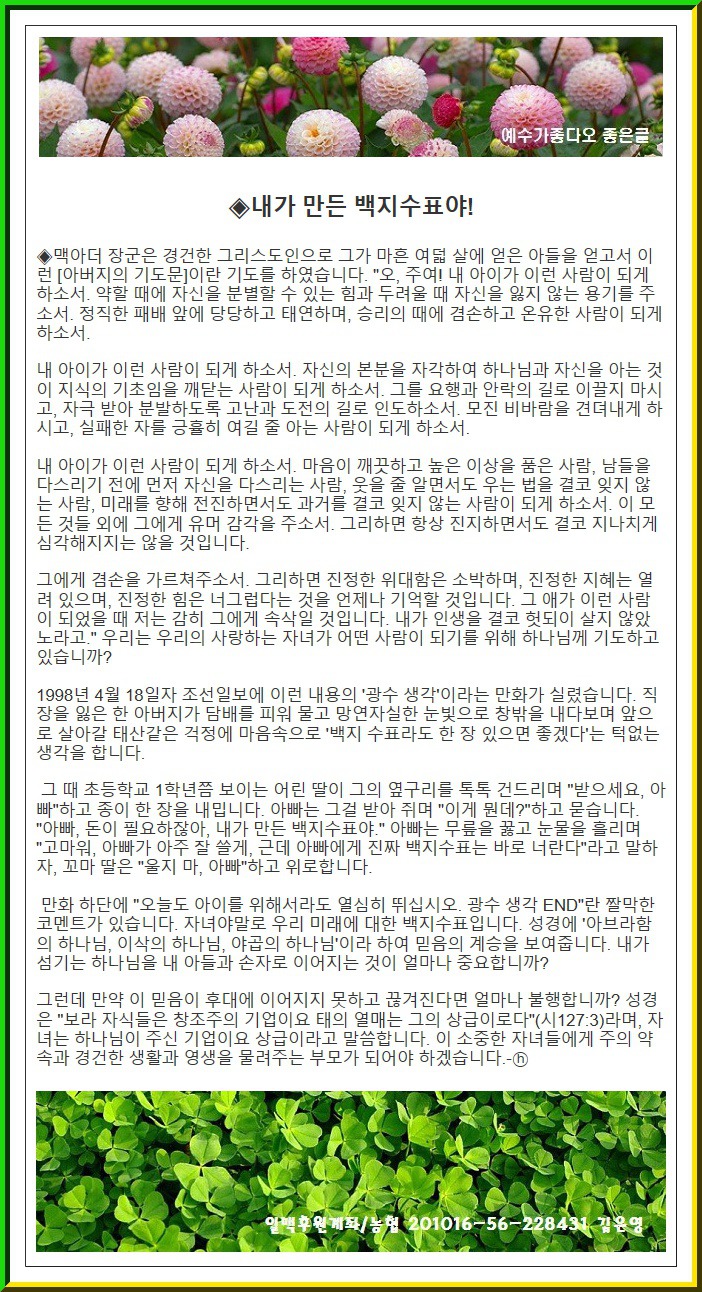 내가 만든 백지수표야! 작성자(一麥.)|작성시간20.06.05|조회수339 목록 댓글 4 글자크기 작게가 글자크기 크게가 ☞예수가좋다오 다음검색 현재 게시글 추가 기능 열기 북마크 공유하기 신고 센터로 신고 댓글 댓글 4 댓글쓰기 답글쓰기 댓글 리스트 작성자담돌 | 작성시간 20.06.05 눈물이 납니다 너무 감동됩니다 아버지. 이 백성들에게 모두 소망을 주옵소서암담하기만 한 이 현실에 빛을 주옵소서 작성자유토피아3 | 작성시간 20.06.05 감사합니다. 작성자세계는 나의 일터 | 작성시간 20.06.05 감사합니다. 작성자이계선 | 작성시간 20.06.05 감사합니다. 댓글 전체보기